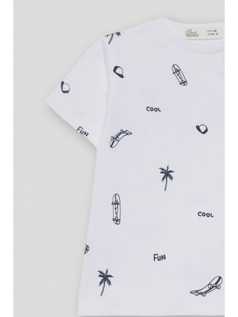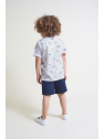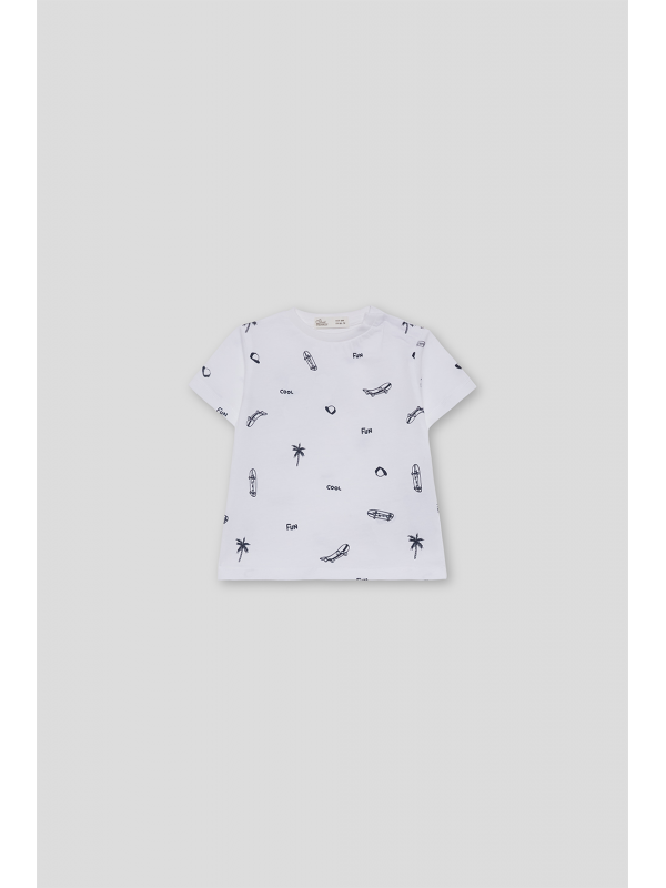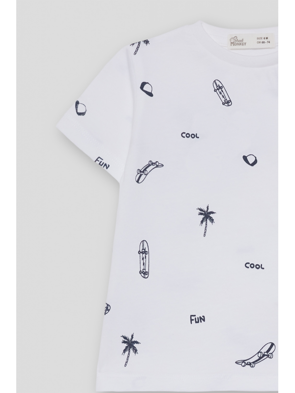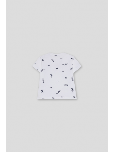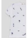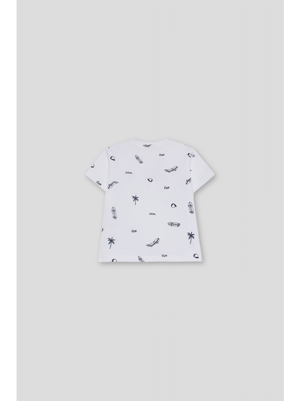 Disponible en color blanco y celeste con estampado all over en contraste de palmeras, monopatines y tipografías. Confeccionada en algodón suave y transpirable, perfecta para looks frescos y divertidos de verano.