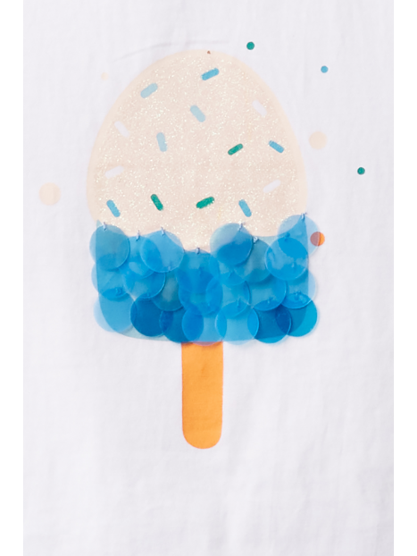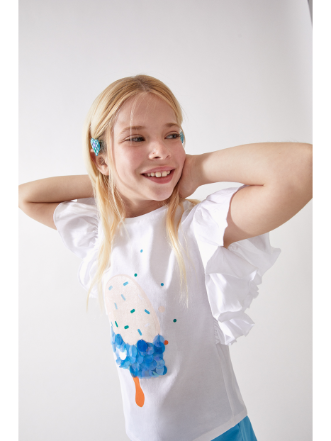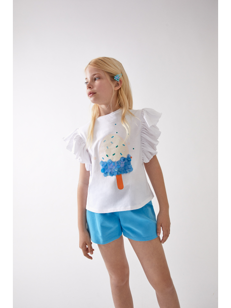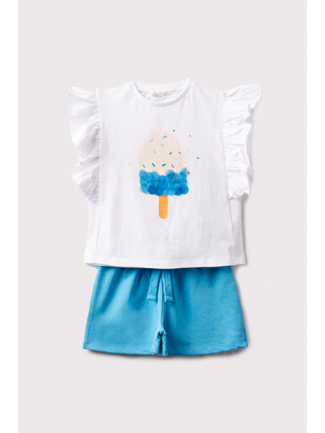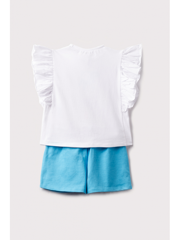 Conjunto de 2 piezas para niña de 2 años a 16 años. Camiseta de manga corta en color blanco, con volantitos en las mangas y con aplique en el centro. Pantalón corto en color azul y cordón en la cintura para un mejor ajuste. Tejido fresco, cómodo y suave para el verano.