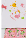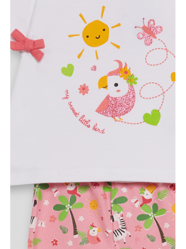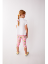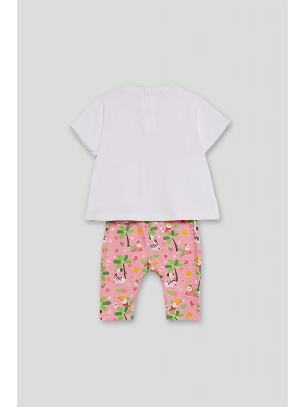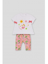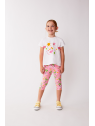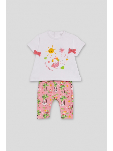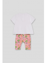 El conjunto se completa con unos leggings pirata en color rosa con estampado floral y animal print en tonos suaves, confeccionados en un tejido elástico y fresco ideal para el verano.