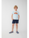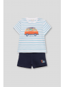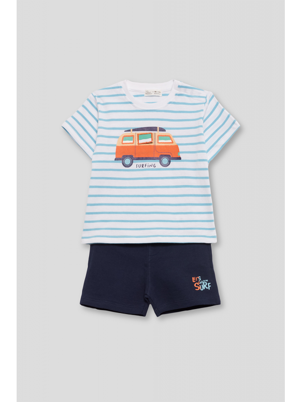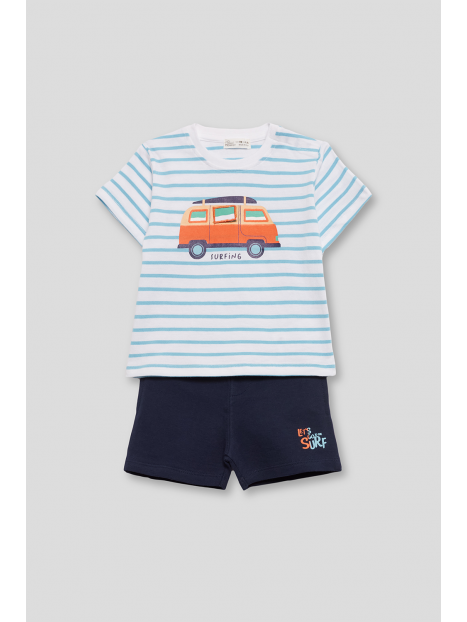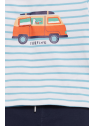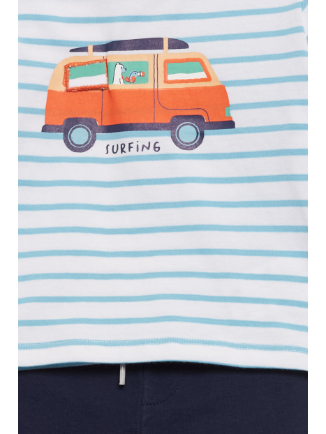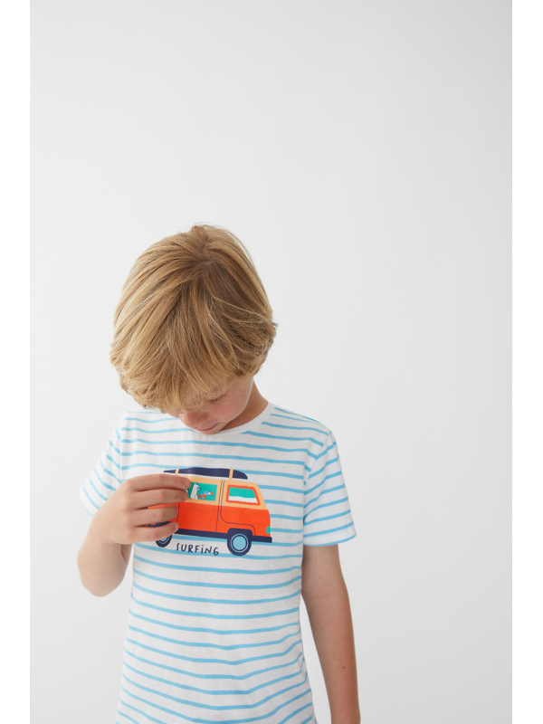 Camiseta de algodón a rayas en tonos azul celeste y blanco, con un llamativo estampado de furgoneta surfera en el centro. Diseño de manga corta y corte cómodo para mayor libertad de movimiento. En tallas de meses, incorpora cierre de botones en el hombro para facilitar la puesta.