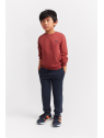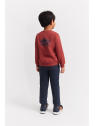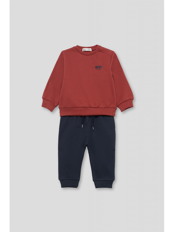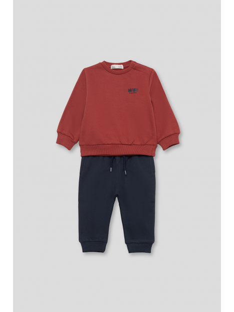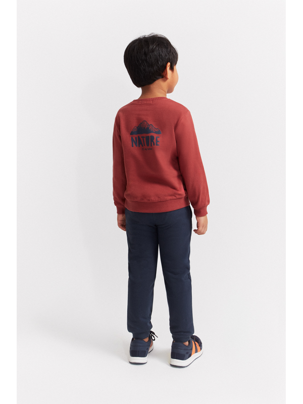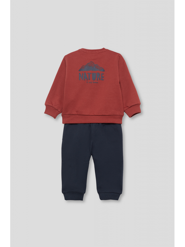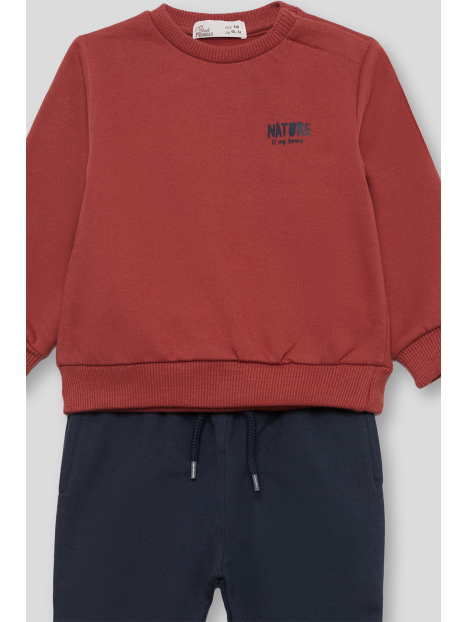 Sudadera de felpa perchada disponible en color crudo o caldera, con diseño montañoso en la espalda y mensaje “Nature is my home” estampado en la parte delantera. Cuello redondo, bajo y puños de canalé y apertura en el hombro con botones a presión en las tallas de meses. Se combina con pantalón tipo jogger en color azul noche o verde amazonas, con cintura elástica y cordón decorativo a contraste. Un conjunto suave y cálido para disfrutar del invierno con estilo y comodidad.