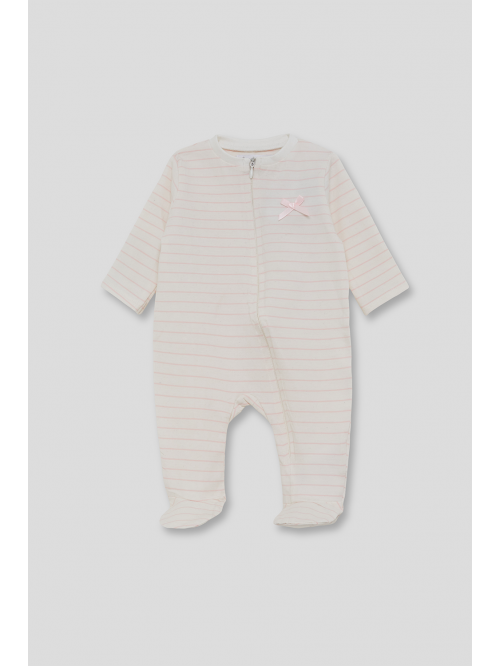 Pelele largo en color blanco con rayas maquillaje y lazo decorativo en el pecho. Manga larga, cuello redondo y cierre delantero con automáticos. Tejido suave y cómodo, ideal para el descanso diario.