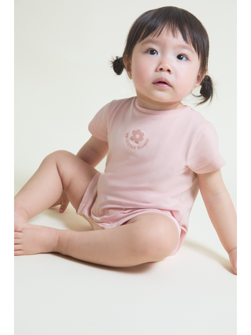 Modelo en color rosa con estampado delantero de flor y mensaje "My little flower". Manga corta, cuello redondo y cierre con automáticos en la espalda. Tejido suave y fresco, ideal para el verano.
