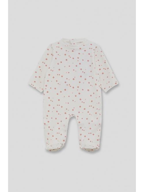 Modelo en color blanco roto y rosa con estampado de pequeñas flores en tono maquillaje. Manga larga, cuello redondo y pies cubiertos para mayor comodidad. Cierre con botones a presión en la espalda y en la entrepierna para facilitar el cambio. Confeccionado en tejido suave, ideal para el día a día.