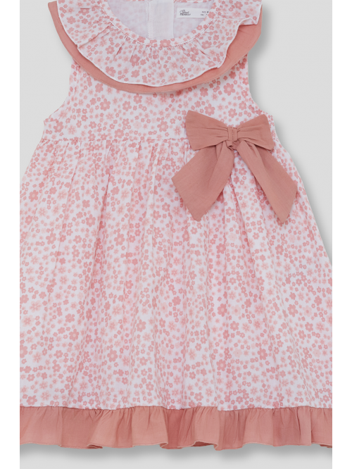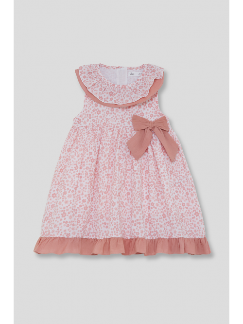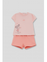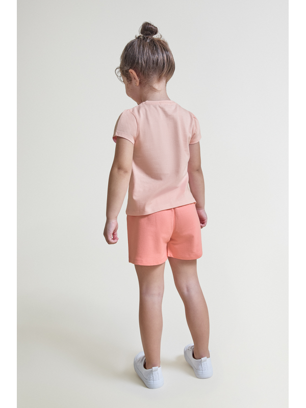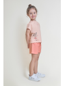 Conjunto de dos piezas para bebé niña de 3 meses a 6 años. Camiseta en color rosa claro con estampado de niña y mariposas en el frontal, cierre con botones en la espalda. Shorts en tono coral con cintura elástica para mayor comodidad. Un conjunto fresco, alegre y cómodo para el verano.