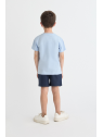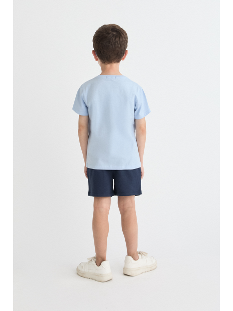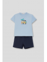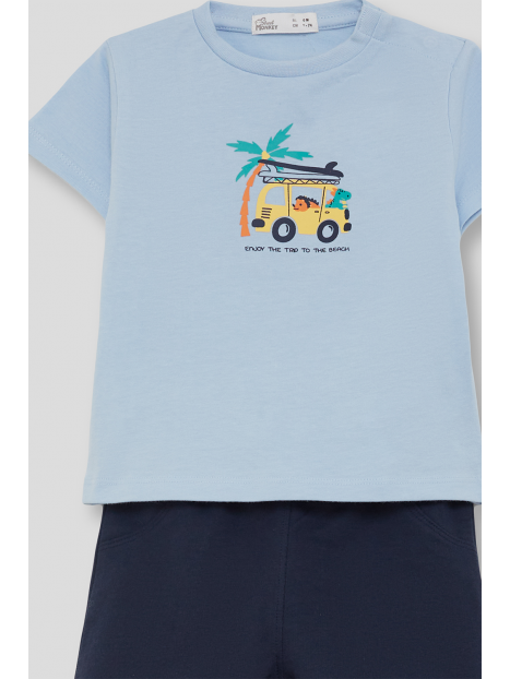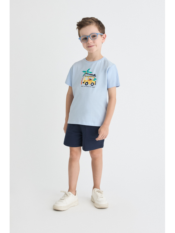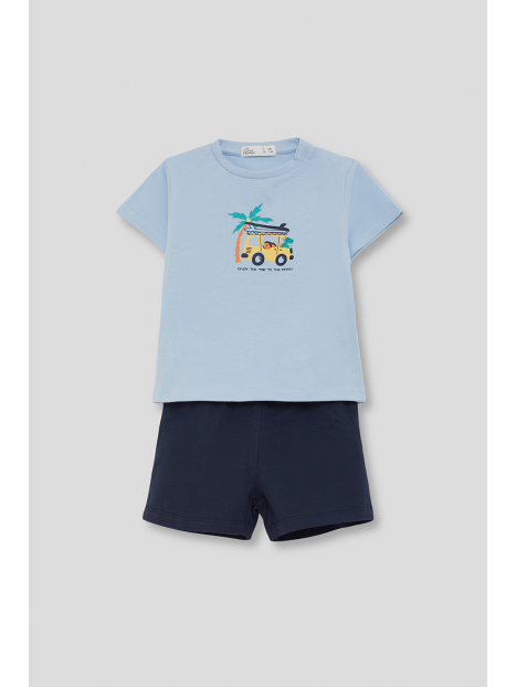 Camiseta azul claro de manga corta con estampado frontal de furgoneta y palmera. Shorts en color azul marino con cintura elástica para un ajuste cómodo.