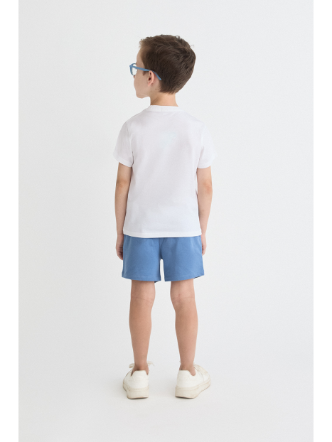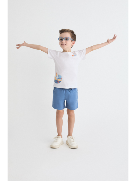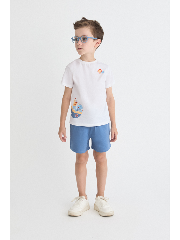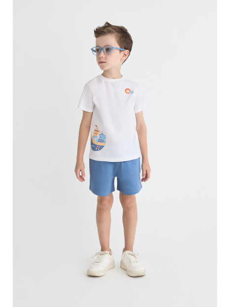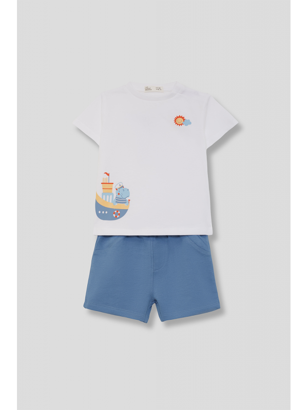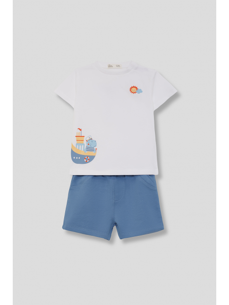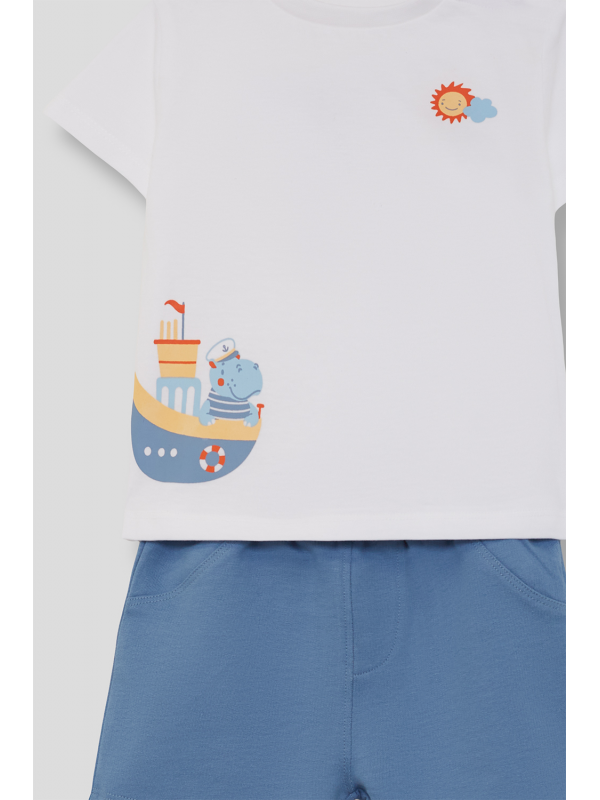 Camiseta blanca de manga corta con estampado de barco y sol. Shorts en azul medio con cintura elástica para un ajuste cómodo.