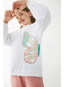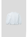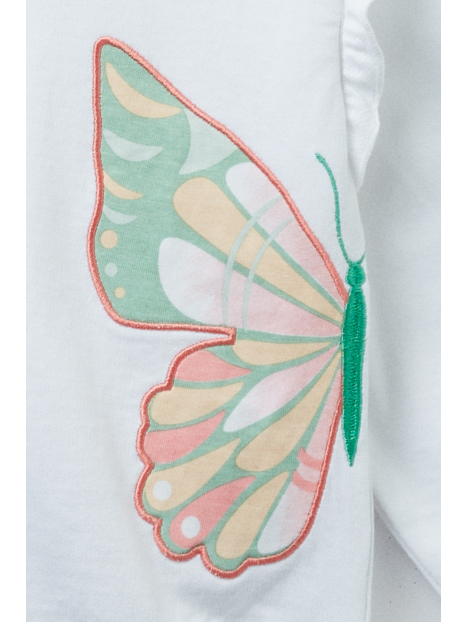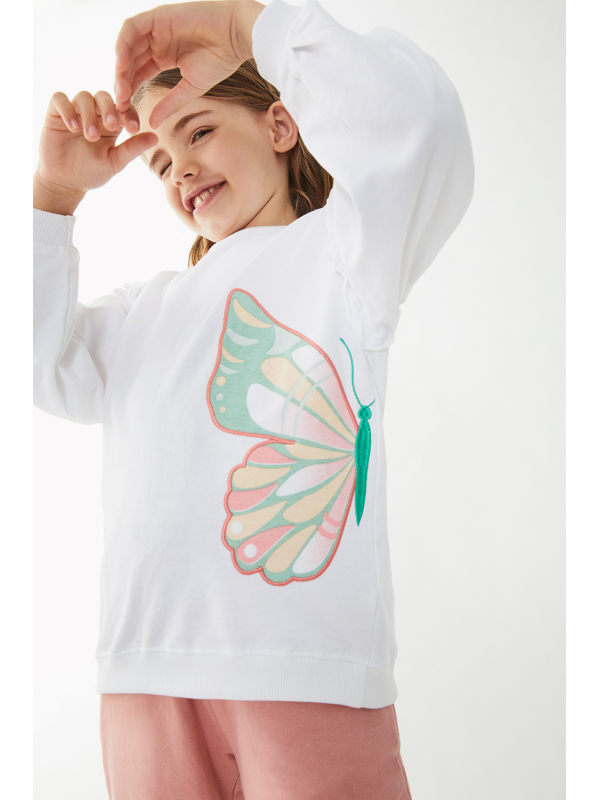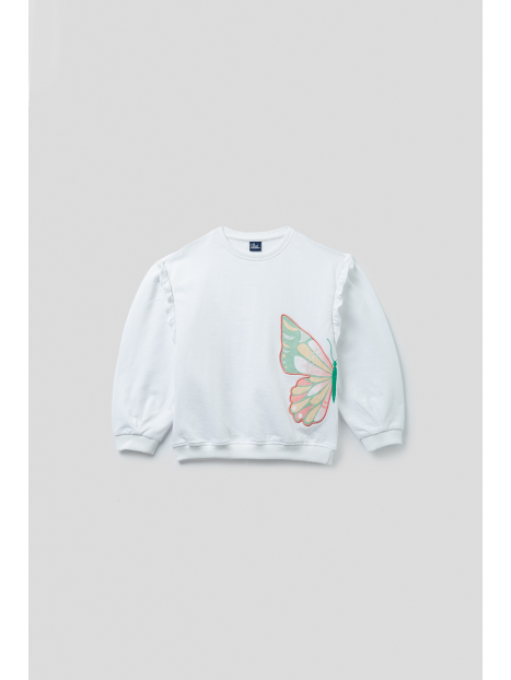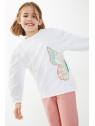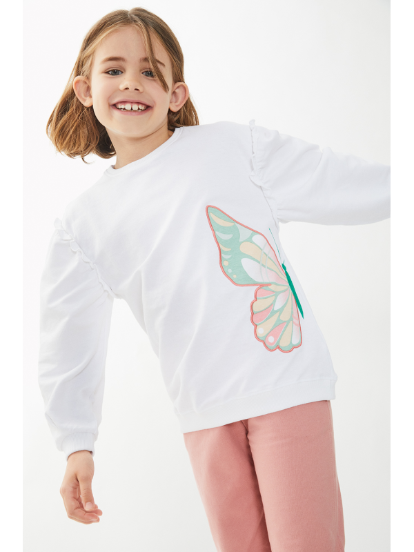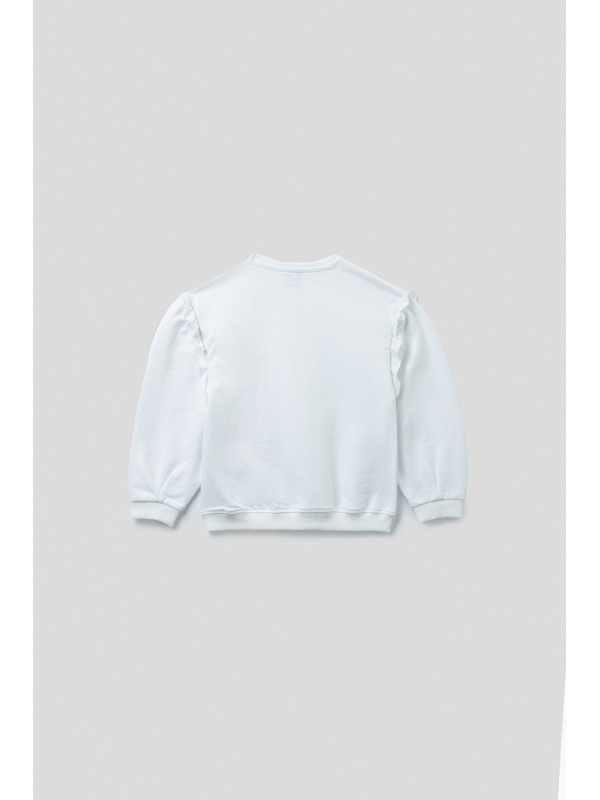 Sudadera de manga larga para niñas de 2 a 16 años en color blanco con estampado en el lado, cuello redondo, detalle de volantes en las mangas y ajuste de puño en las mismas.