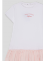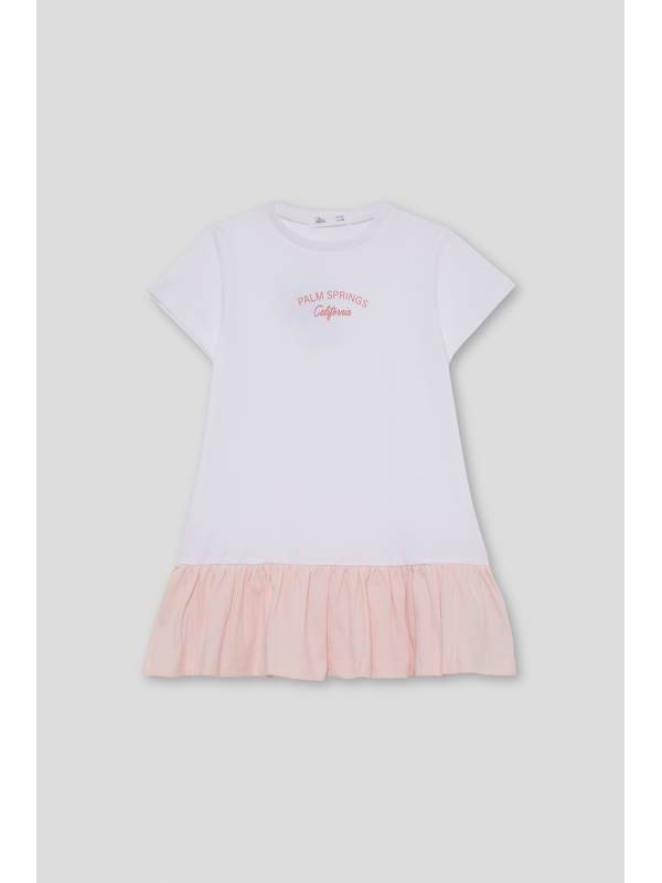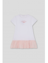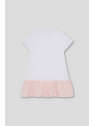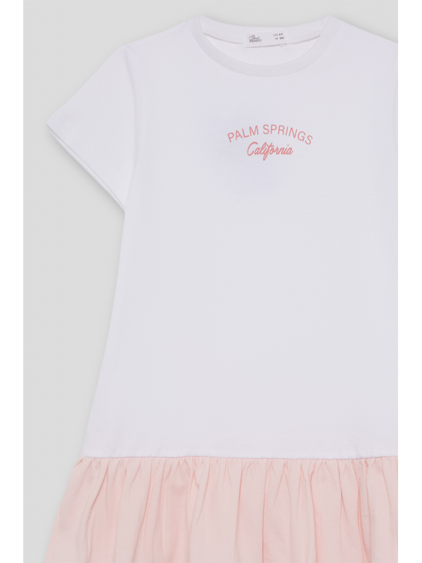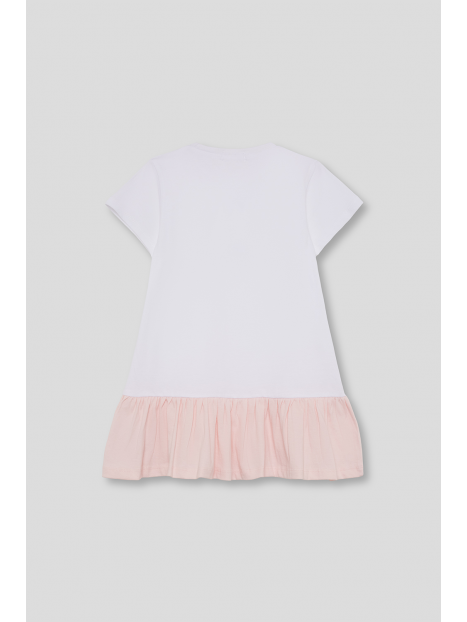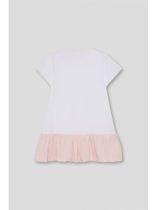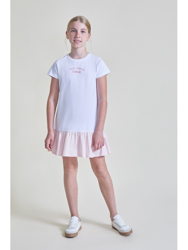 Vestido de niña disponible de la talla 2 a 16 años. Color blanco con volante rosa en el bajo y detalle de estampado en el pecho. Ligero y cómodo, ideal para looks frescos y versátiles en días de verano.