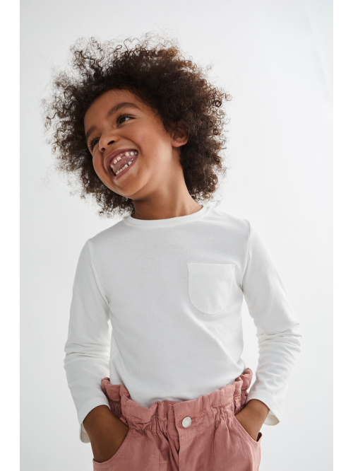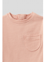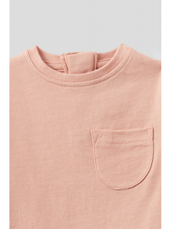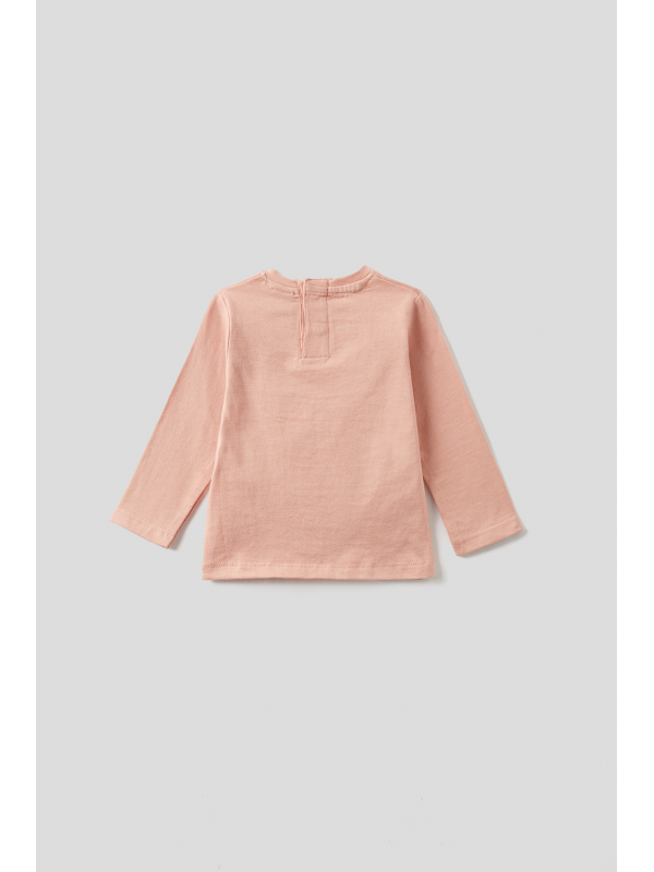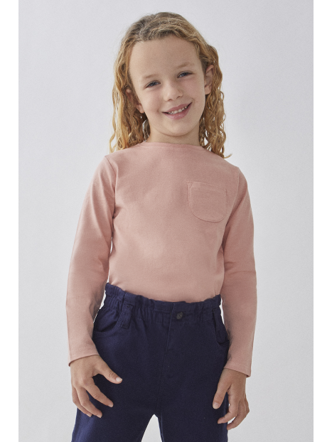 Camiseta confeccionada en suave punto de algodón, con cuello redondo, manga larga y pequeño bolsillo en el pecho. Incorpora abertura trasera con botones a presión en las tallas de meses, para facilitar la puesta. Un básico cómodo y fácil de combinar, ideal para el día a día.