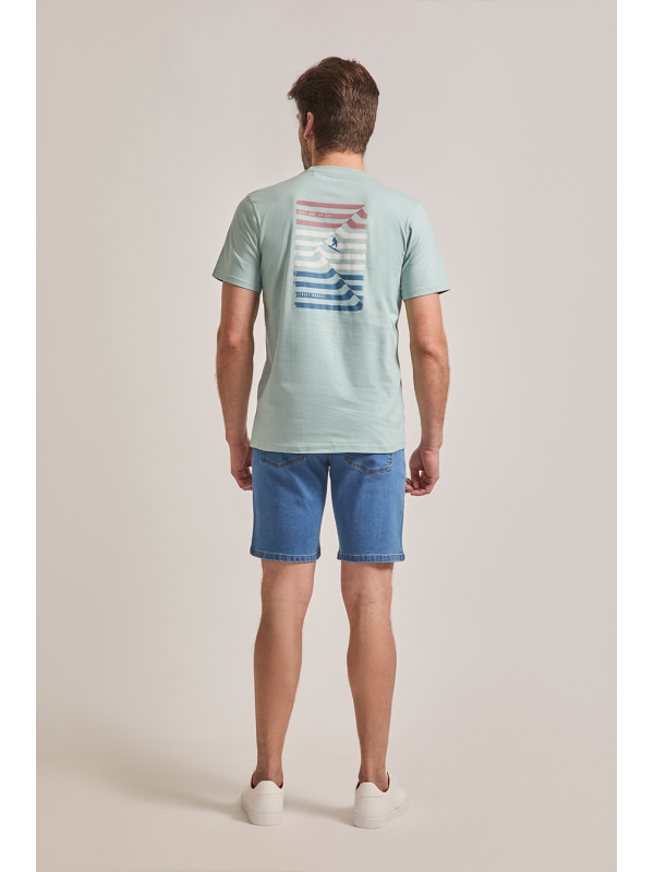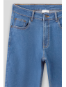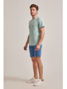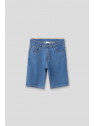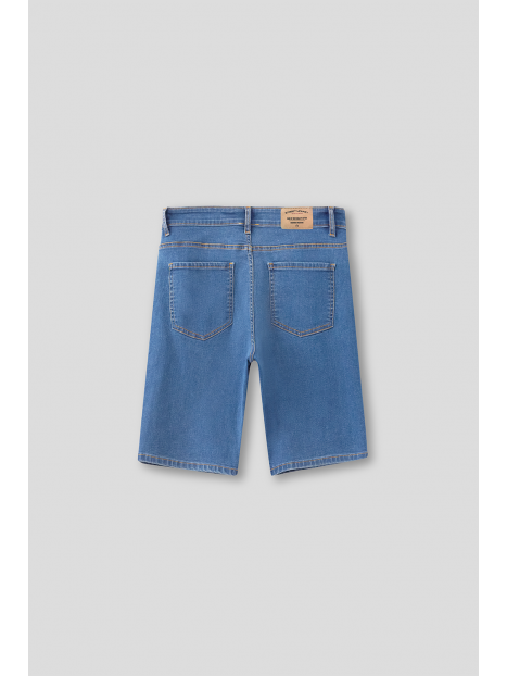 Bermuda estilo denim con cinco bolsillos. Cierre central mediante botón y cremallera, pespuntes en color camel, fornituras personalizadas y etiqueta en efecto piel en la cinturilla.