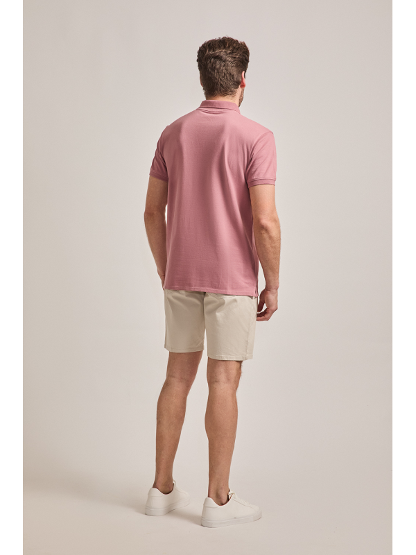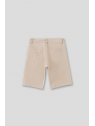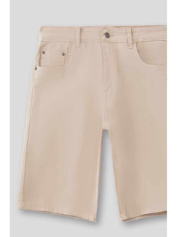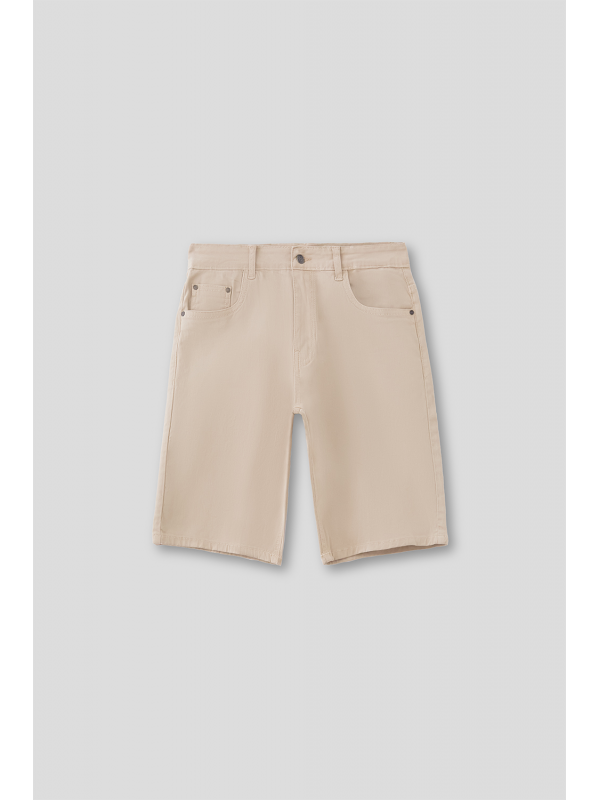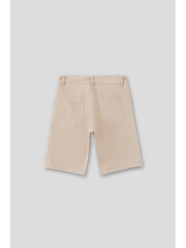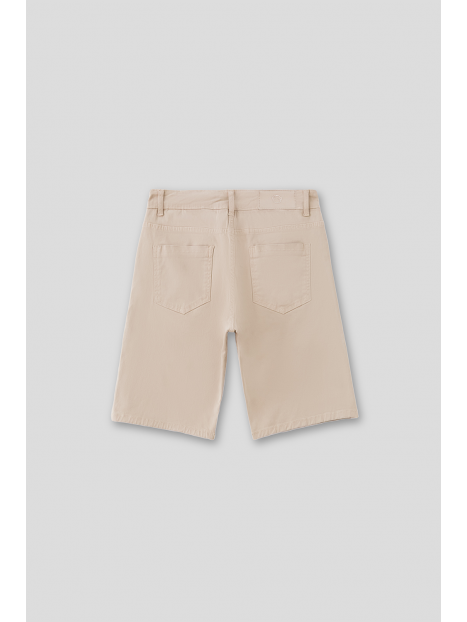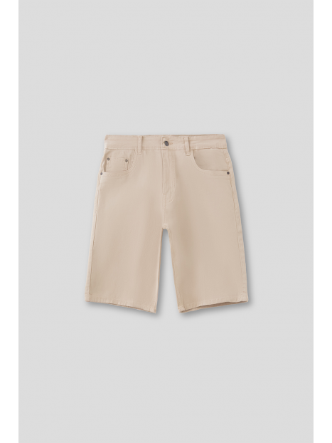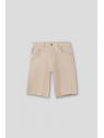 Bermuda estilo denim con cinco bolsillos. Cierre central mediante botón y cremallera, fornituras personalizadas y etiqueta en efecto piel en la cinturilla.