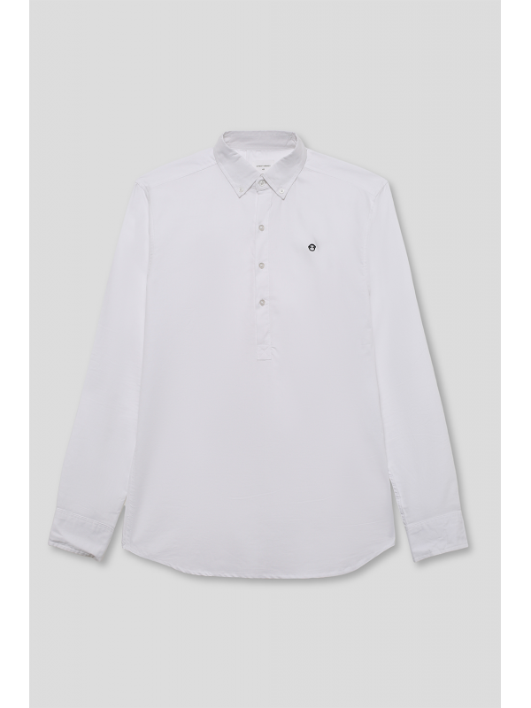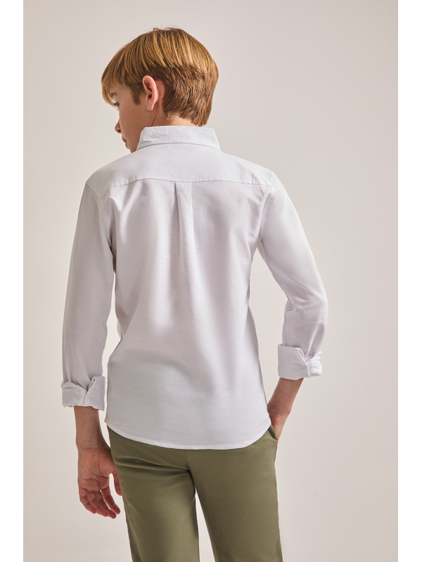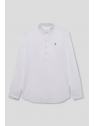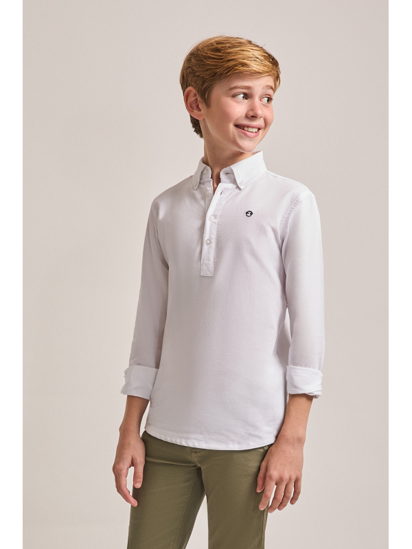 Camisa de manga larga tipo polo para niño. Diseño liso con cuello abierto y tapeta de botones, confeccionada en tejido ligero y cómodo.