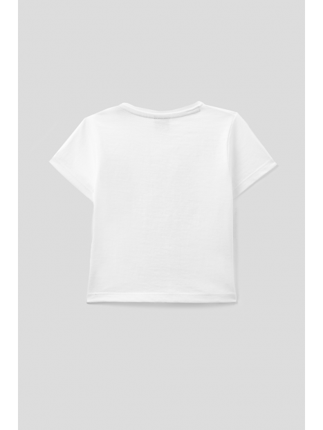Short sleeve T-shirt in white with fun print in the center in aquamarine green, red and beige. Snap button closure at shoulder for sizes 3 - 24 months.
