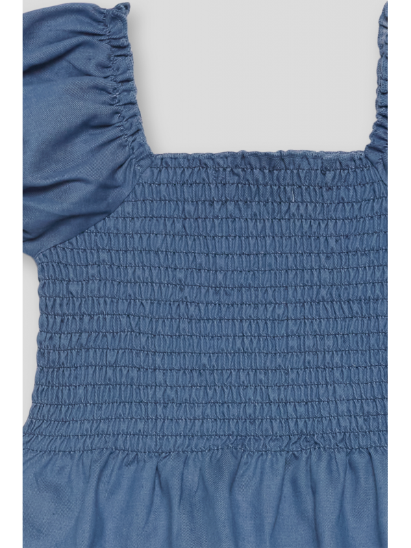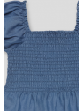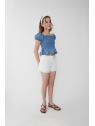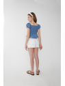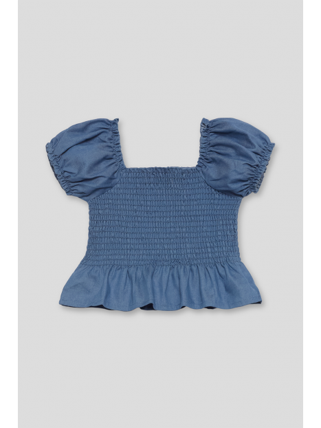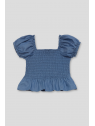Top de tejido denim ligero con un diseño moderno y femenino. Su escote cuadrado y las mangas abullonadas con frunces le dan un toque romántico, mientras que el cuerpo de nido de abeja se ajusta perfectamente para un look cómodo y favorecedor. El bajo con volante añade un acabado delicado y encantador.