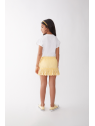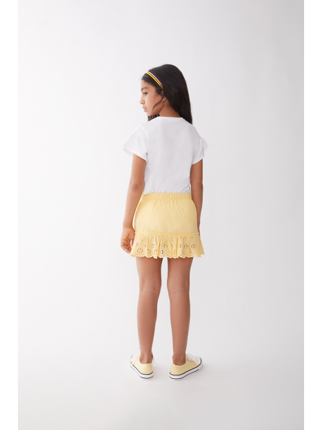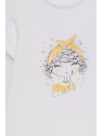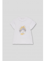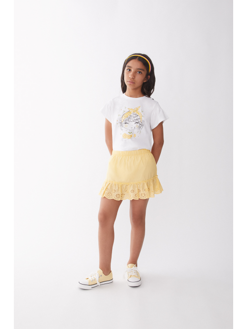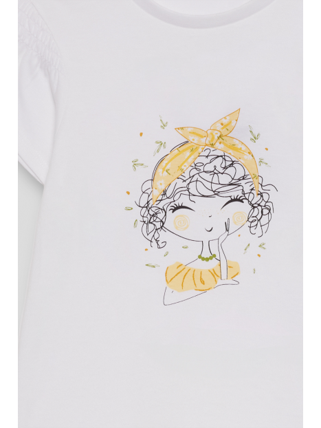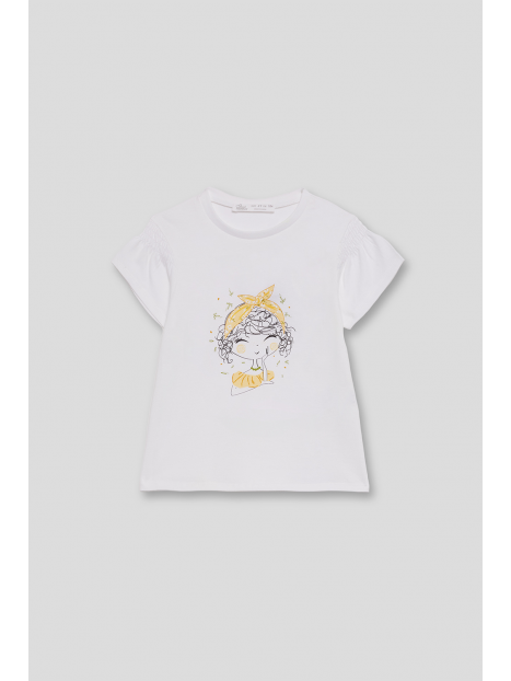Camiseta de manga corta para niña de 2 a 16 años. Camiseta en color blanco con un delicado estampado ilustrado de una niña con pañuelo en tonos cálidos, que aporta un toque dulce y encantador. Sus mangas cortas con fruncido en los hombros añaden un detalle femenino y sutilmente voluminoso. El corte holgado y el cuello redondo la hacen una prenda fresca y cómoda para el verano. Confeccionada en algodón suave y transpirable, es ideal para combinar con faldas o shorts y crear un look ligero y encantador para los días soleados.