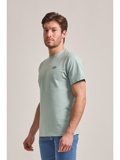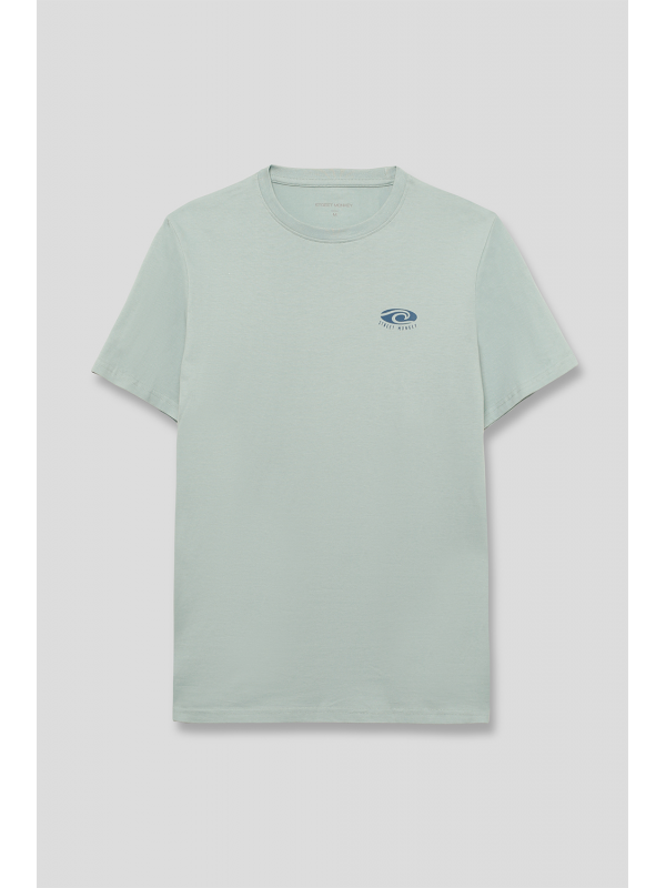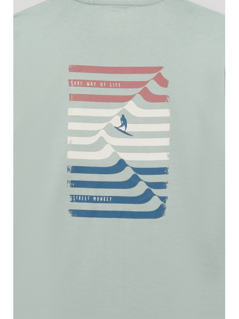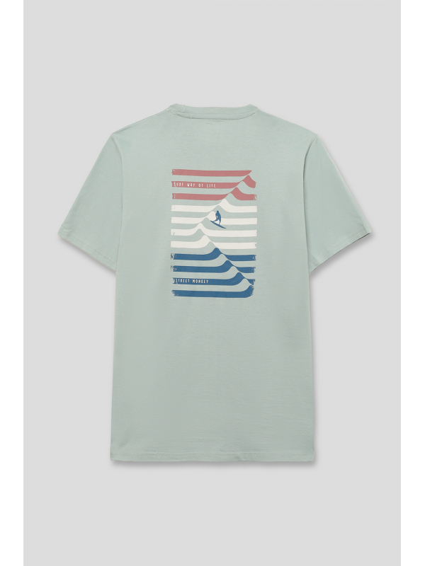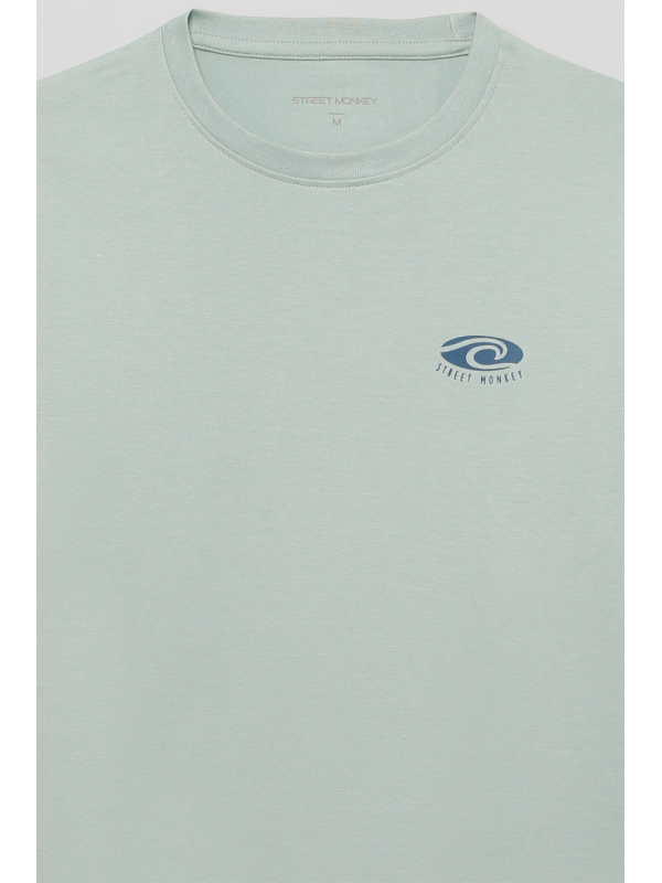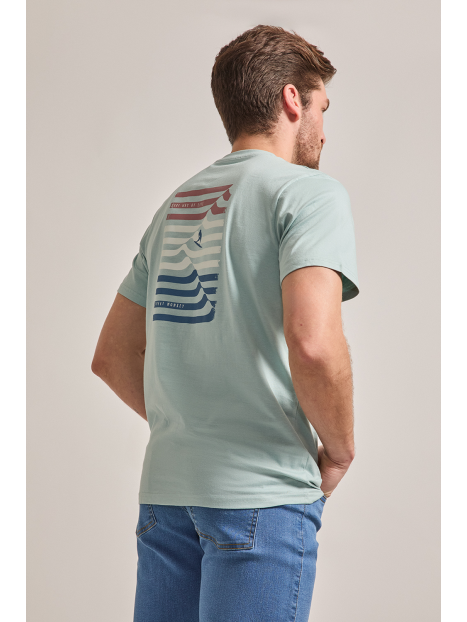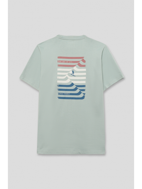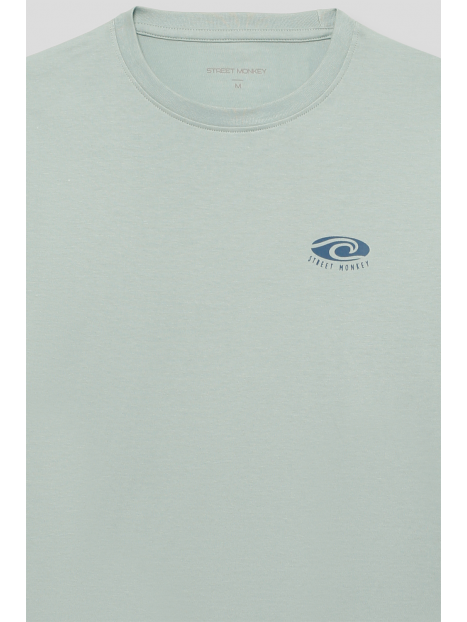 Camiseta de color azulado con estampación personalizada en el frontal confeccionada en algodón. Cuenta con cuello redondo, manga corta y corte regular fit. Incorpora un diseño estampado en la espalda.