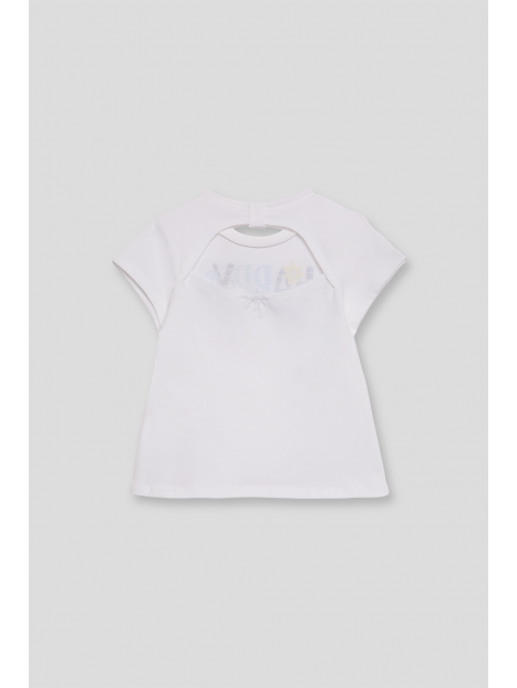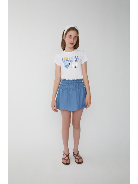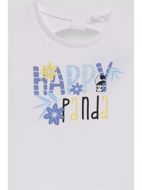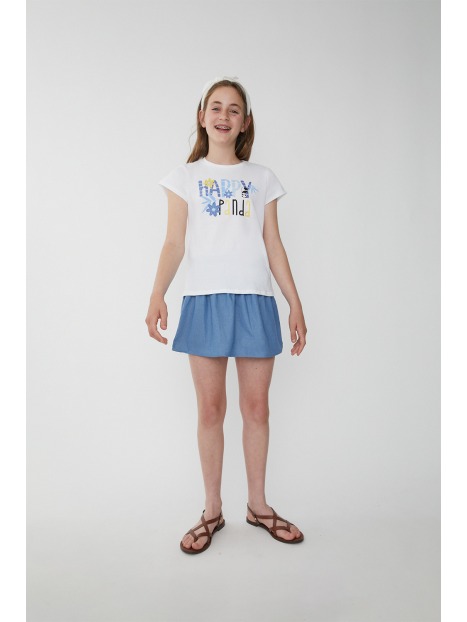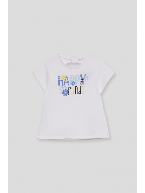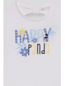 Camiseta de manga corta en algodón suave con un alegre estampado que combina letras decorativas, flores y un simpático panda. La frase "Happy Panda" aporta un toque divertido y optimista. Diseño con abertura en la espalda para un detalle coqueto y fresco.