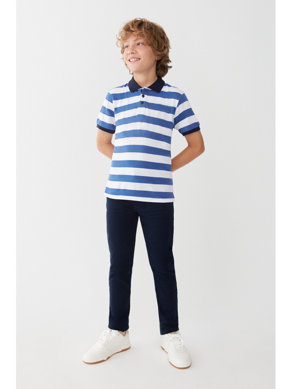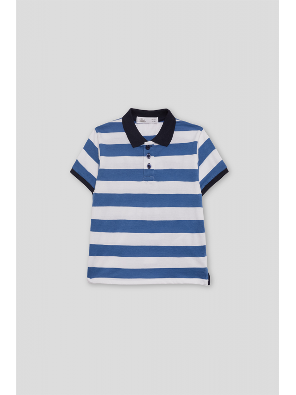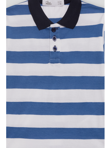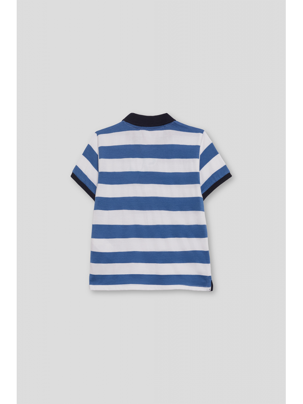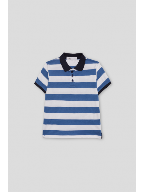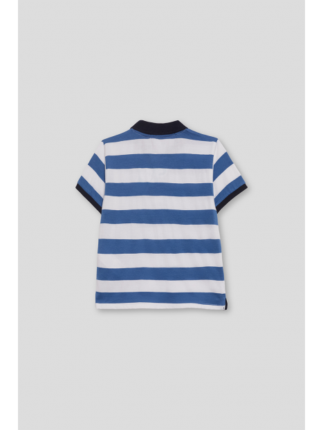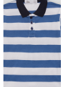 Este polo de estilo clásico y moderno combina rayas anchas en azul y blanco para un look fresco y veraniego. Cuenta con cuello de punto en color azul marino y una tapeta con tres botones que le añaden un toque elegante y versátil. Las mangas cortas terminan con un ribete en el mismo tono del cuello, aportando armonía al diseño.