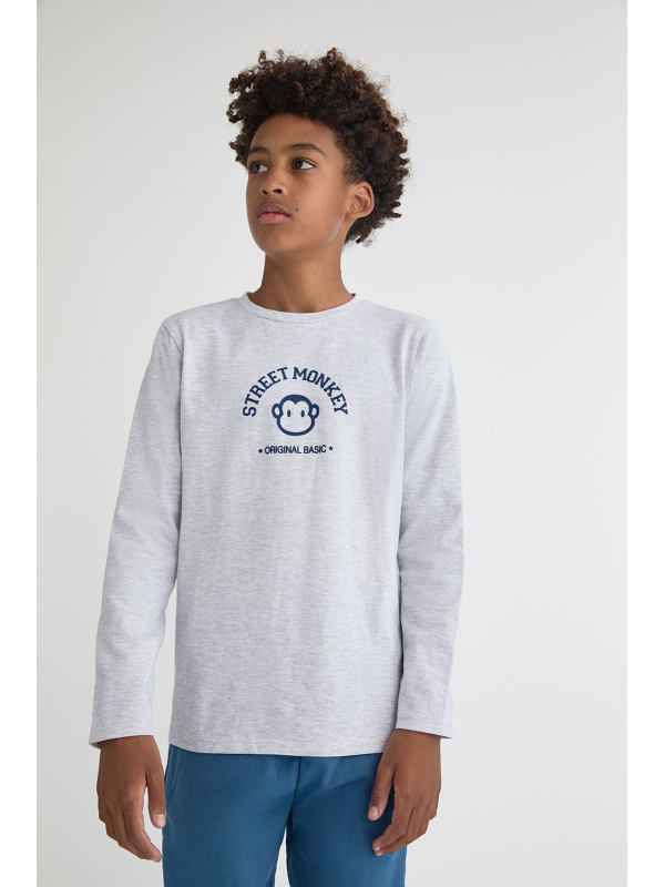 Camiseta para niño de 2 a 16 años disponible en varios colores: gris melange, azulina, blanco y marino. Esta camiseta de manga larga es perfecta para cualquier ocasión, combinando estilo y comodidad en un diseño divertido y versátil. Presenta el texto "Street Monkey Original Basic" acompañado de un simpático mono, añadiendo un toque de originalidad y encanto al atuendo de cualquier niño.