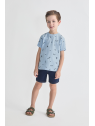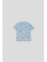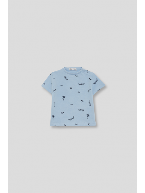 Disponible en color blanco y celeste con estampado all over en contraste de palmeras, monopatines y tipografías. Confeccionada en algodón suave y transpirable, perfecta para looks frescos y divertidos de verano.