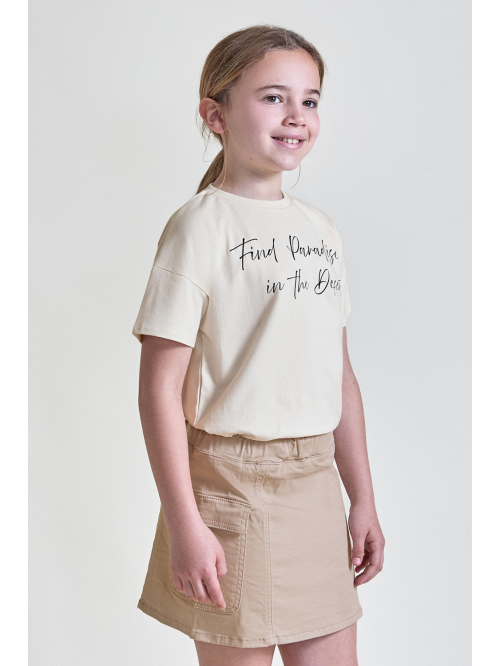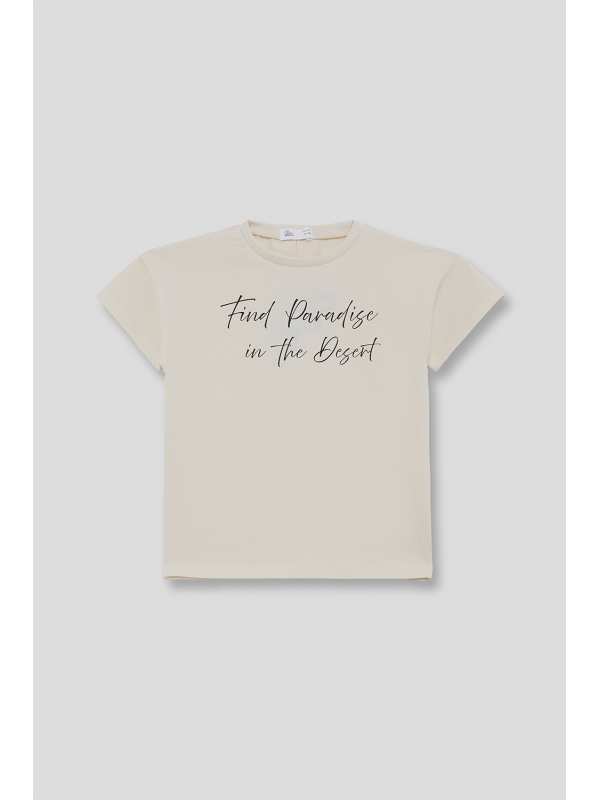 Diseño en color beige con estampado frontal “Find Paradise in the Desert”. Confeccionada en algodón suave, perfecta para combinar en looks de verano.