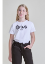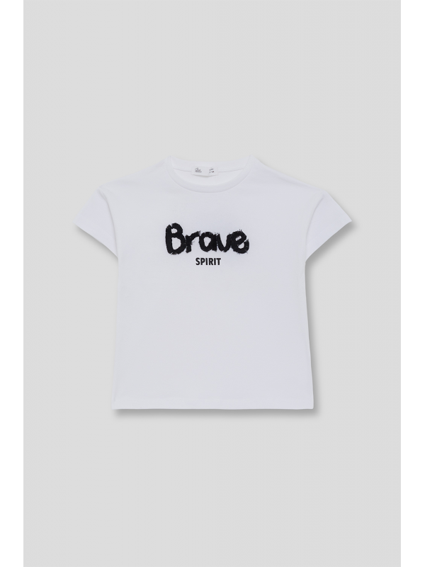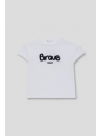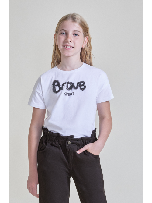 Camiseta de manga corta para niña de 2 a 16 años en color blanco y negro. Diseño con texto “Brave Spirit” en relieve negro, ideal para un look cómodo y con personalidad.