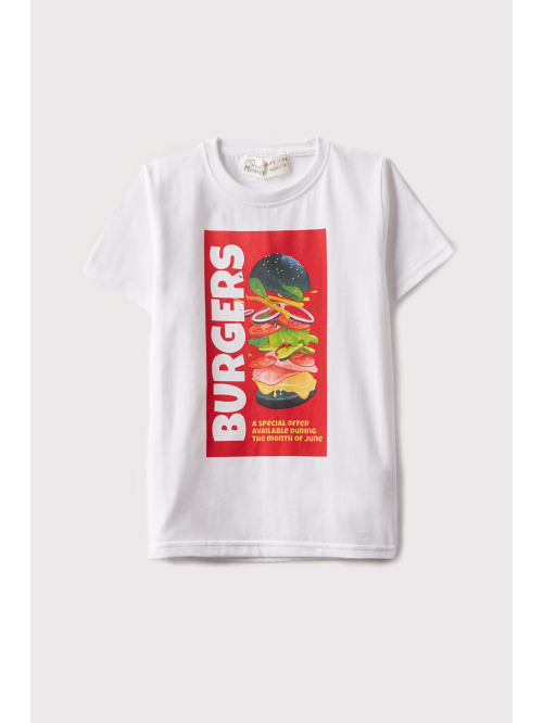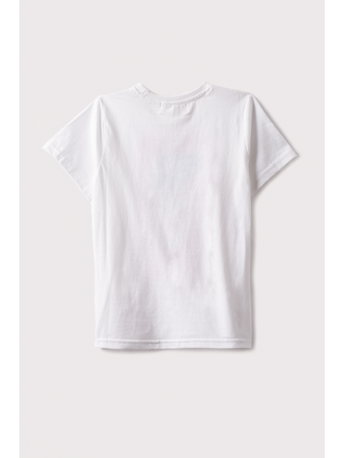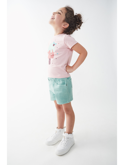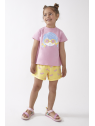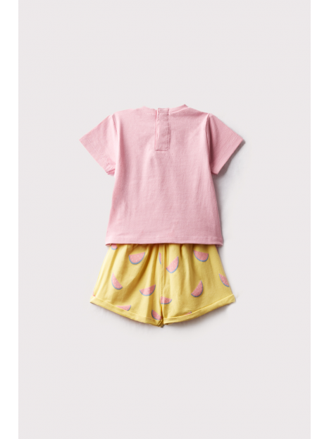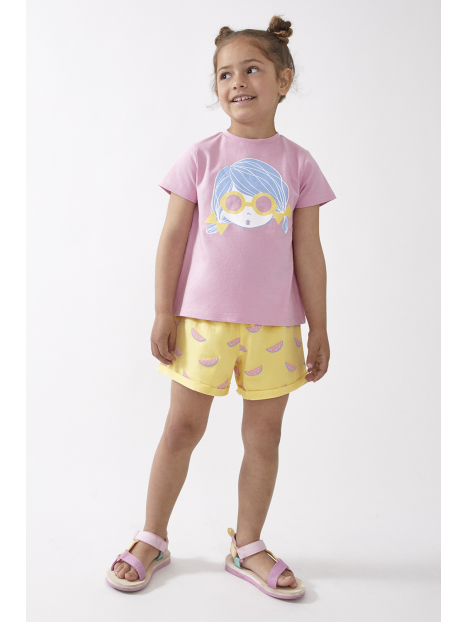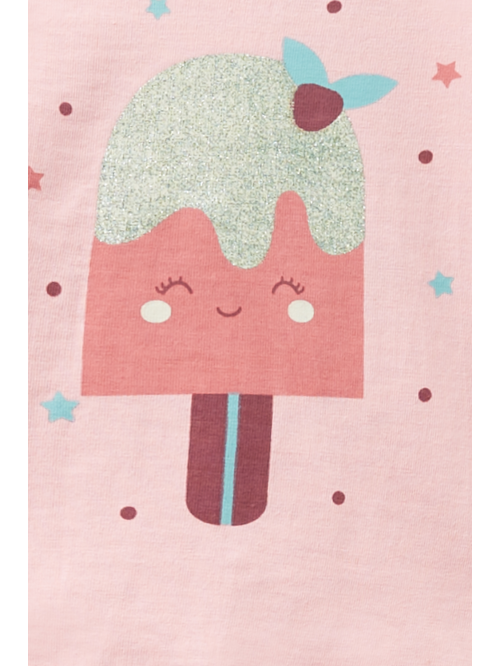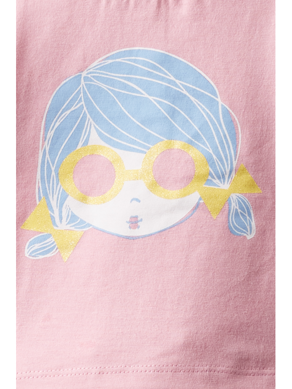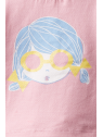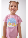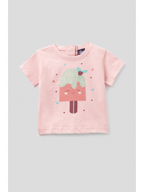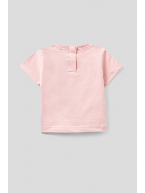 Camiseta en color rosa con cuello redondo y manga corta, dibujo en la parte delantera, cierre con botones a presión en la espalda.
