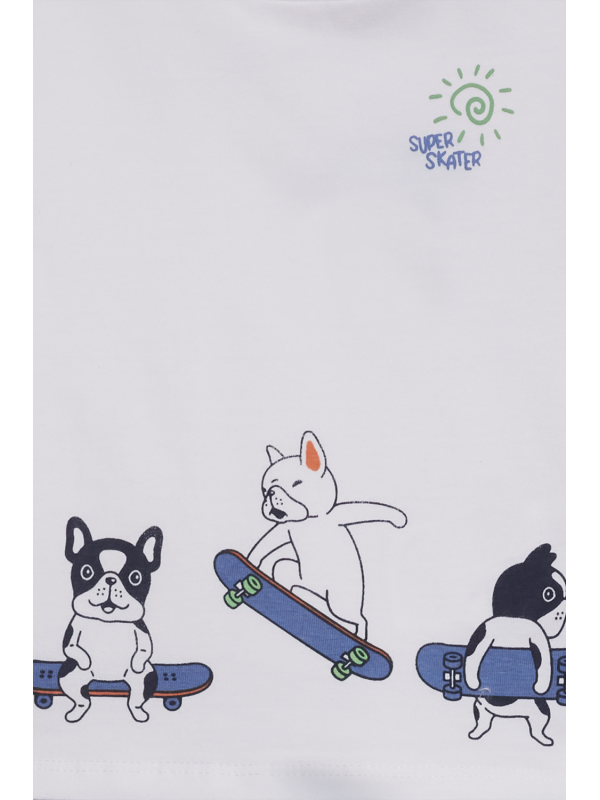 La camiseta blanca luce un grupo de perros skaters que añaden un toque divertido y aventurero al atuendo, perfecto para un joven explorador.