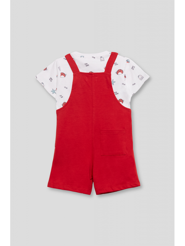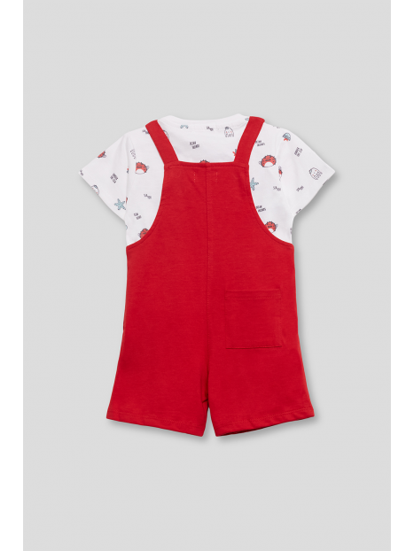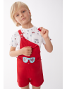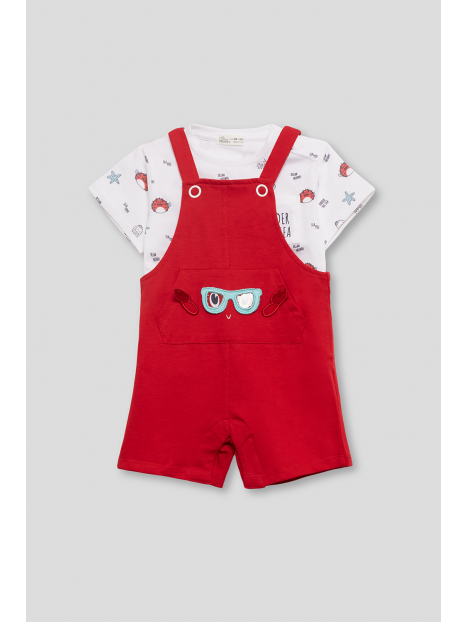 La camiseta blanca está decorada con un encantador estampado de motivos marinos, incluyendo cangrejos y peces, perfecta para un día de diversión bajo el sol. El peto rojo complementa maravillosamente con detalles lúdicos como un par de gafas bordadas en el bolsillo frontal, aportando un toque de originalidad.