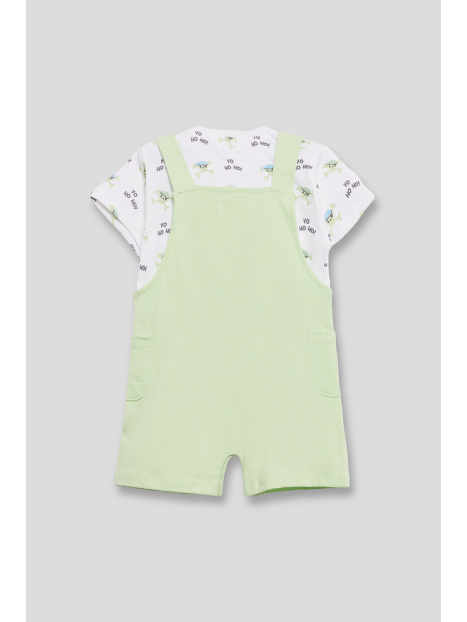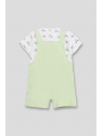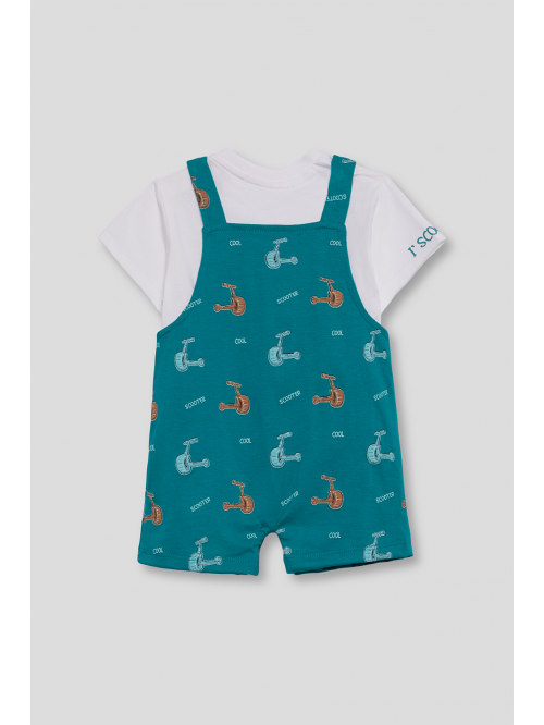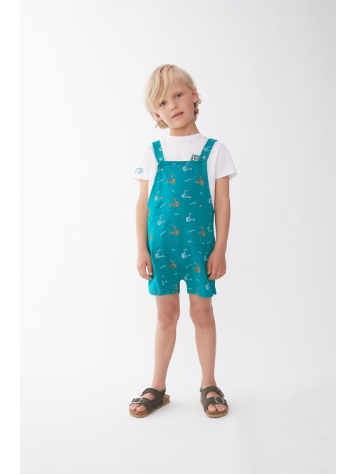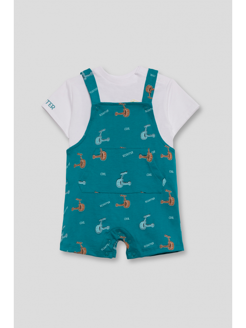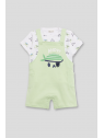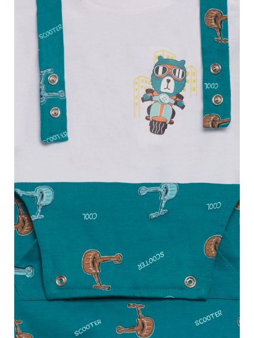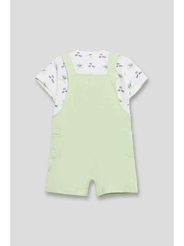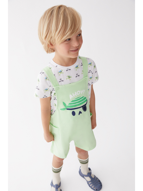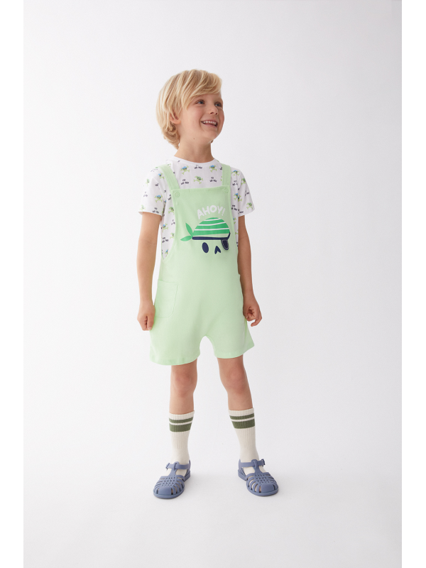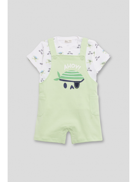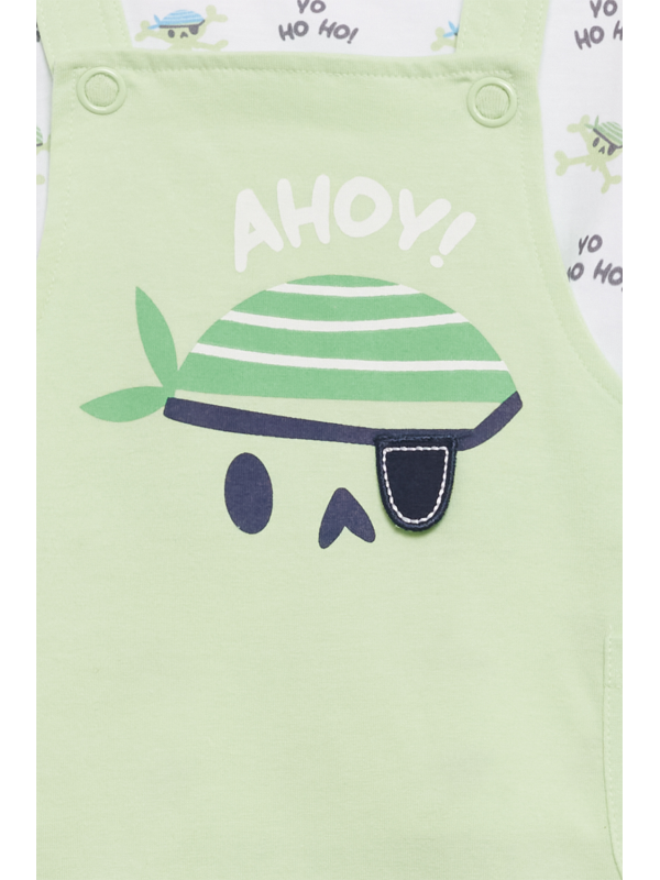 Peto corto en tono verde menta con un original diseño de calavera pirata en el frontal y detalle de bolsillos laterales. Tirantes ajustables con botones y broches a presión en la entrepierna para mayor comodidad.