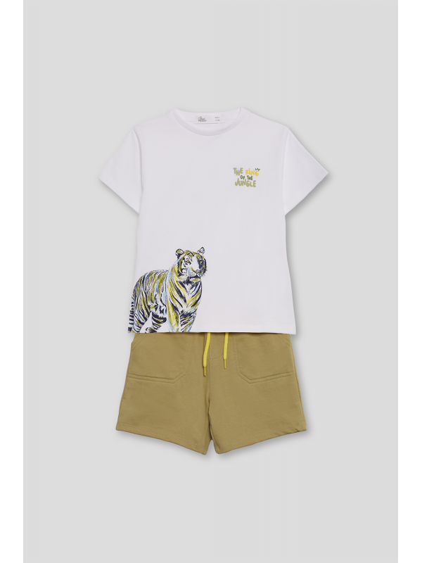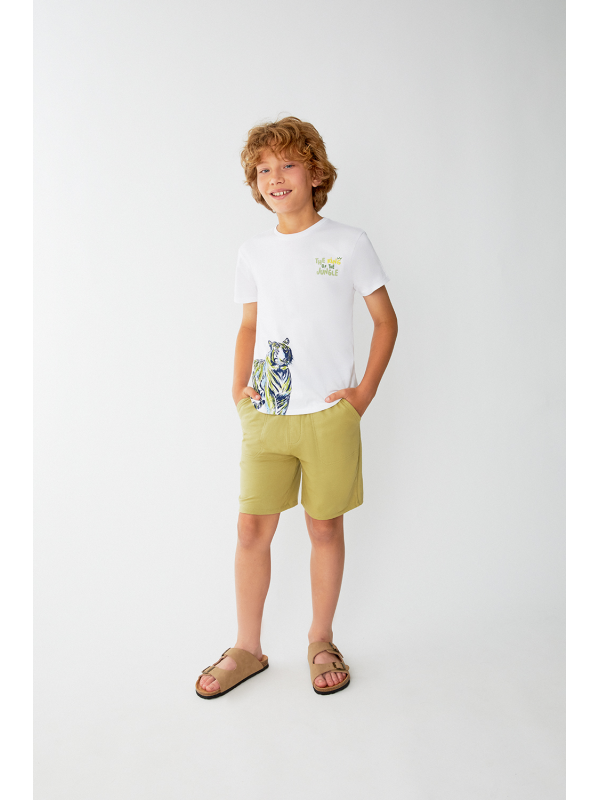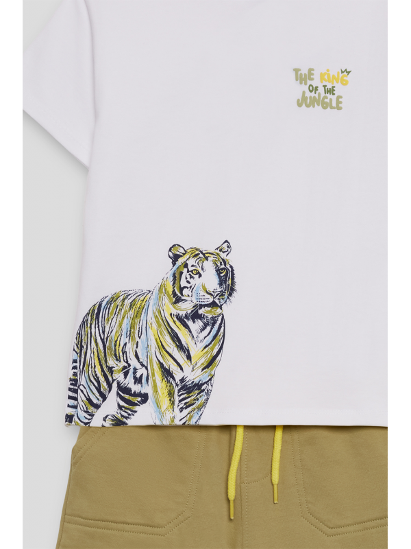 Camiseta blanca de manga corta con ilustración de tigre en tonos negro y amarillo sobre el bajo lateral, junto con la frase "The King of the Jungle" en el pecho. Un diseño imponente y lleno de estilo para los pequeños aventureros.
