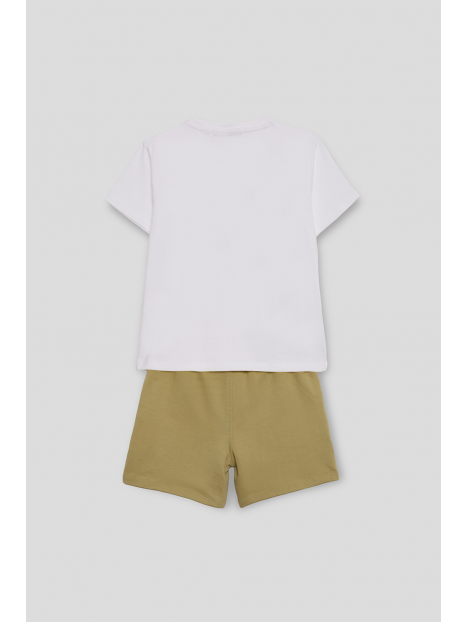 El conjunto se completa con shorts en tono caqui con bolsillos delanteros y ajuste de cintura elástica con cordón amarillo, asegurando comodidad y un ajuste perfecto.