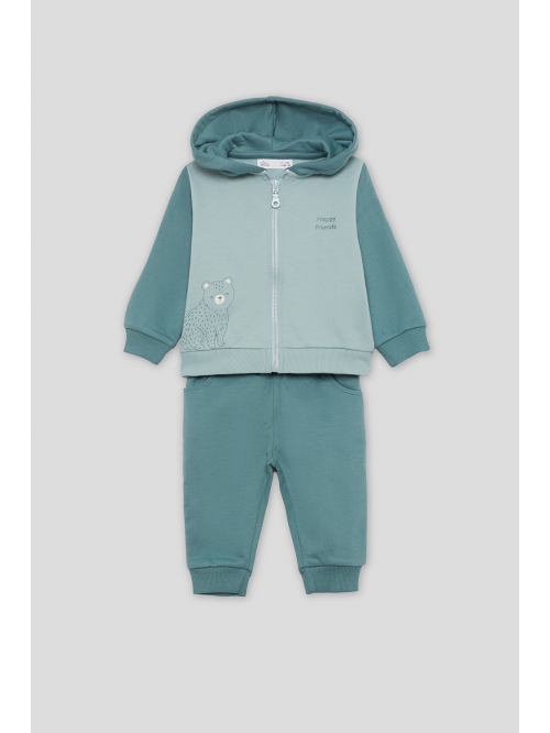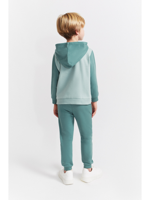 Sudadera en color crudo con capucha y cremallera central, decorada con estampado de dinosaurio en uno de los bolsillos delanteros y el texto “WILD” en el pecho en colores a contraste. Pantalón largo en color verde azulado con cintura elástica y bajo ajustado para mayor confort. Un conjunto cómodo y divertido para que se mueva con libertad cada día.