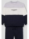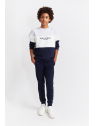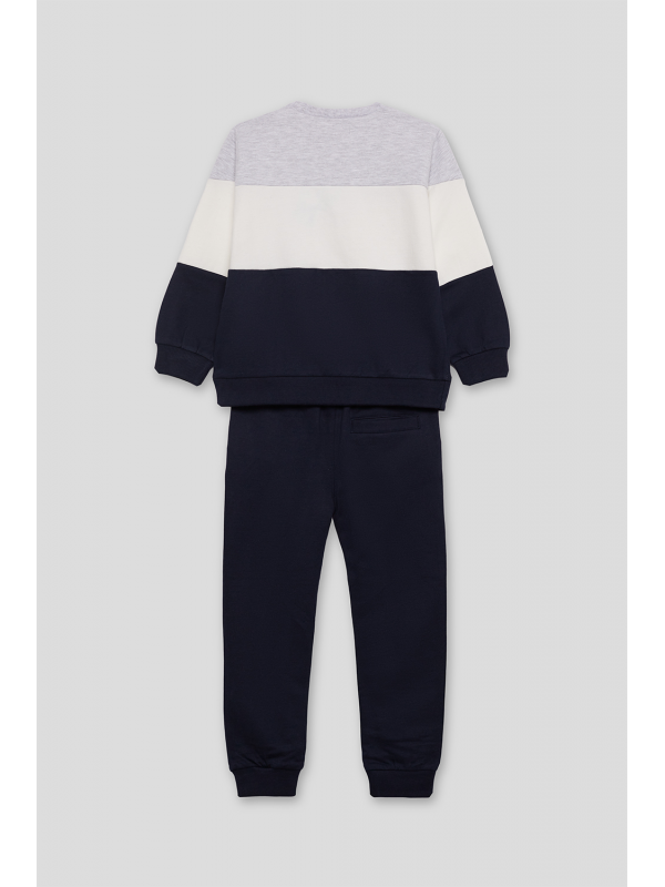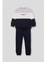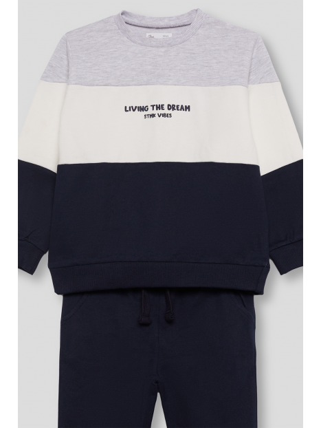 Conjunto de dos piezas, sudadera y pantalón jogger para niño de 2 a 16 años. Sudadera de manga larga en bloques de color gris vigoré, crudo y azul marino, con cuello redondo y puños de canalé. Lleva el mensaje “LIVING THE DREAM / STMK VIBES” bordado en el pecho. El pantalón a juego, en azul marino, presenta cinturilla elástica con cordón ajustable y bajos acabados en canalé para un ajuste cómodo. Un look actual y cómodo para disfrutar del día a día con estilo.