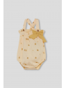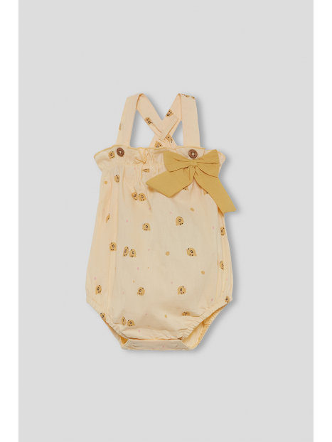 Ranita en color maíz con estampado de pequeños pollitos y lunares. Diseño con tirantes que se cruzan en la espalda y botones en la parte delantera para mayor ajuste. Destaca el lazo decorativo en tejido liso al tono colocado en la cintura, que aporta un aire delicado y coqueto. La prenda cuenta con goma elástica en las piernas para un mejor ajuste y comodidad en el movimiento.