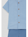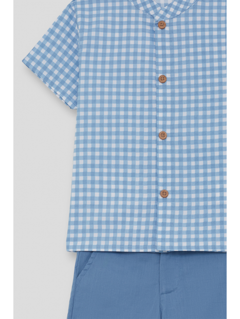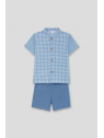Camisa de manga corta en estampado vichy azul medio con cierre de botones delanteros. Bermuda en azul liso con bolsillos laterales y cintura ajustable. Un conjunto fresco y cómodo, perfecto para el verano.
