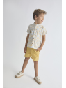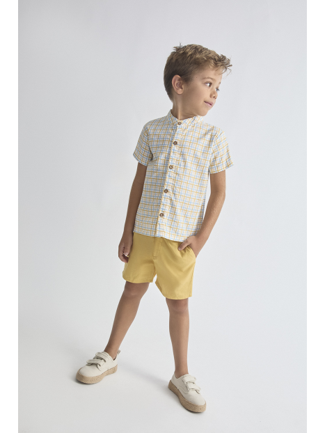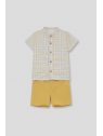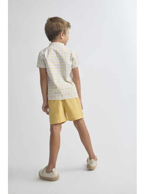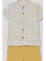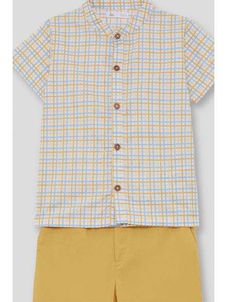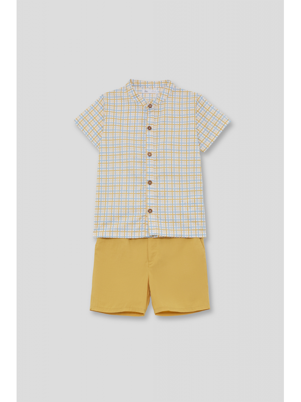 Conjunto de dos piezas para bebé de 1 a 24 meses. Camisa de manga corta en cuadro amarillo y azul con botones de madera y cuello mao. Pantalón corto en color amarillo, con cintura elástica para mayor comodidad.