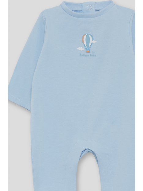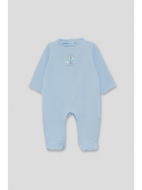En color celeste con estampado central de globo aerostático en tonos suaves. Diseño de manga larga y pies cerrados, con cierre de botones a presión en la espalda y entrepierna para mayor comodidad.