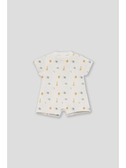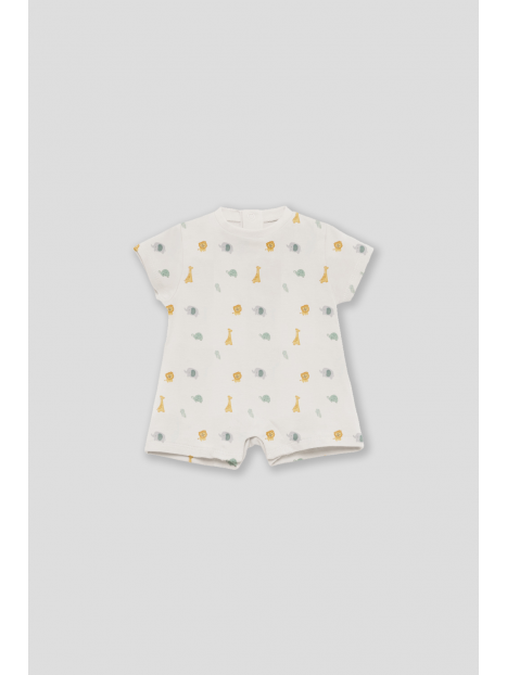 Pelele corto para bebé de 1 a 24 meses. En color blanco con estampado integral de jirafas, leones, elefantes y hojas en tonos suaves. Diseño de manga corta y cuello redondo, con cierre de botones a presión en la espalda y entrepierna para facilitar el cambio.