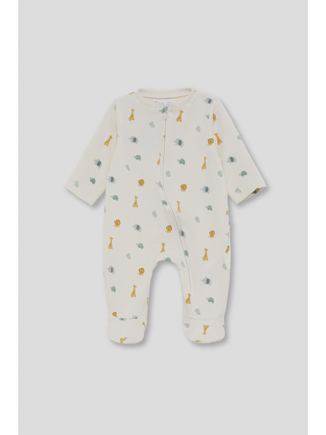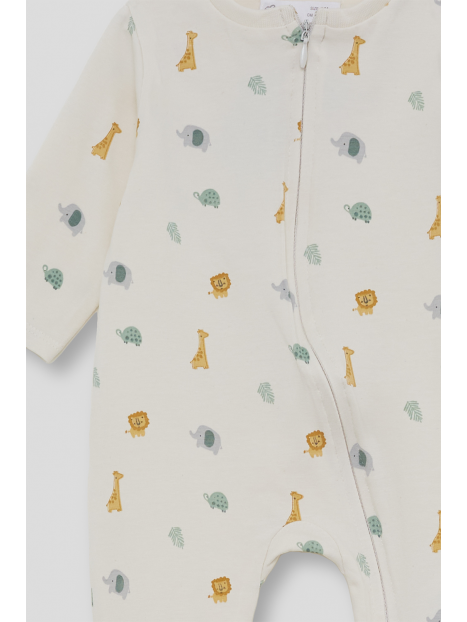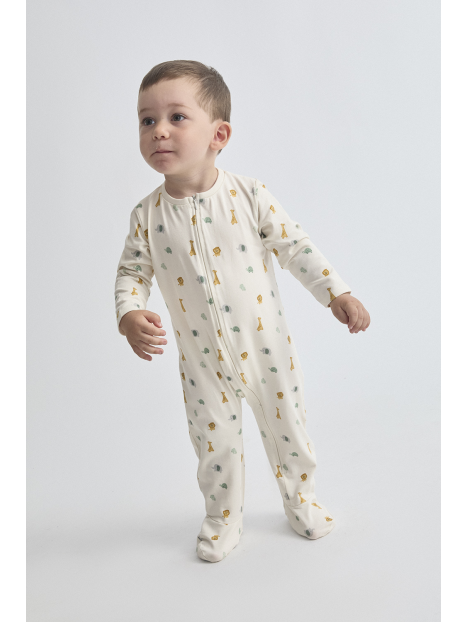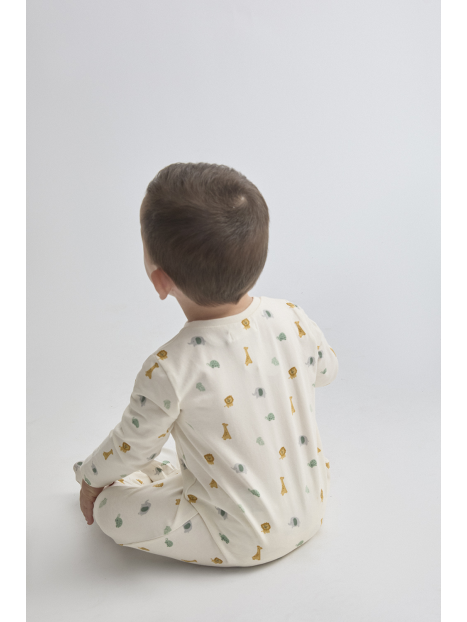En color blanco con estampado integral de jirafas, leones, elefantes y hojas en tonos suaves. Diseño de manga larga y cuello redondo, con cierre delantero de cremallera para mayor comodidad.