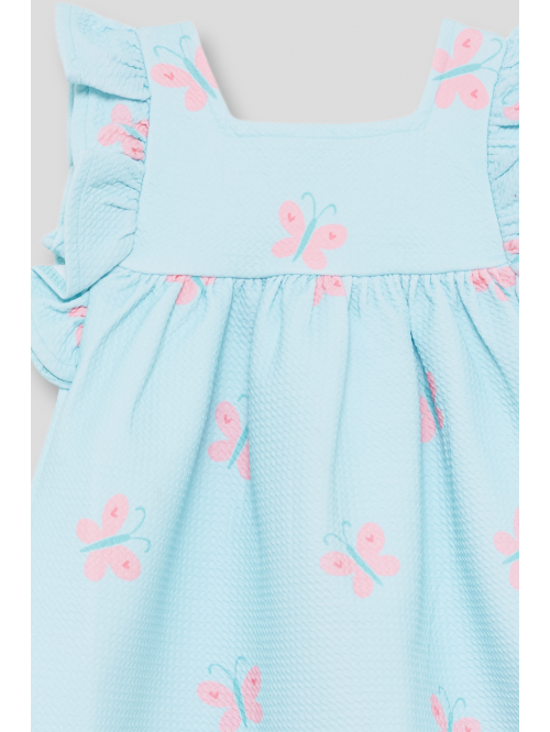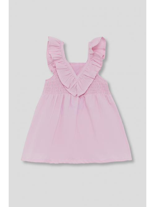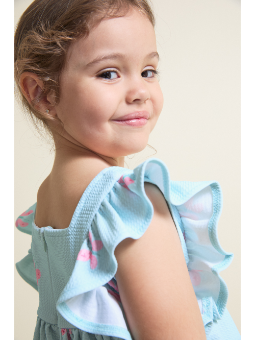 Blusa sin mangas en color crudo con estampado de fresas y flores, detalle de volantes en los tirantes y acabado con vuelo. Shorts a juego en color crudo con el mismo estampado, cómodos y frescos para el verano.
