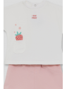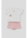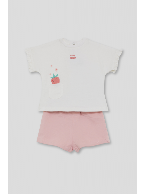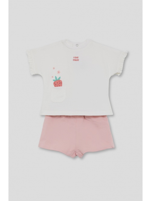 Camiseta en color crudo con estampado de fresa, volante en las mangas y bolsillo decorativo. Pantalón corto en rosa con cintura elástica para un ajuste cómodo.
