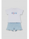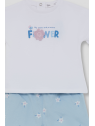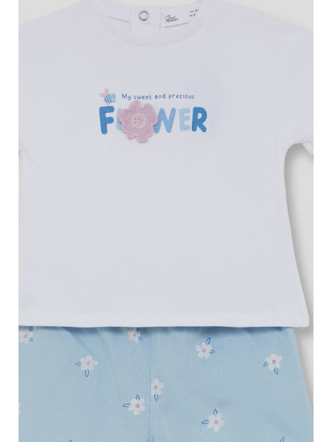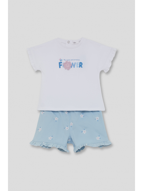 Conjunto de dos piezas, camiseta y shorts para bebé niña de 3 meses a 6 años. Camiseta blanca con detalle de volantes en las mangas y estampado frontal con aplicación de flor. Shorts celestes con estampado de flores y volantes en el bajo.