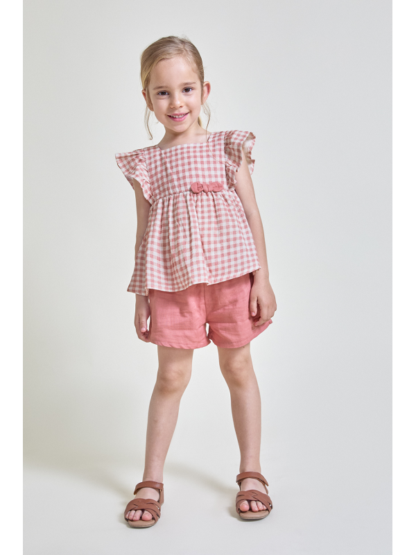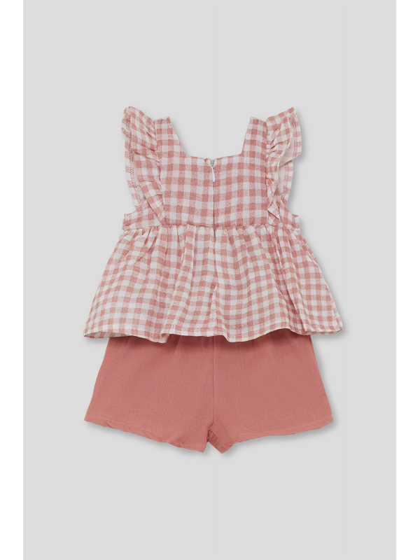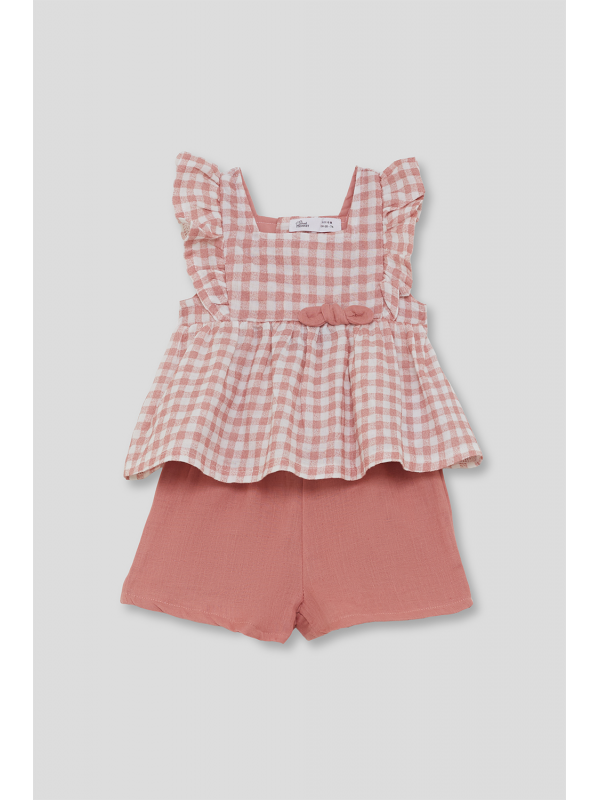 Blusa sin mangas en vichy maquillaje con volantes y lazo decorativo en la cintura. Shorts lisos a juego en color maquillaje, con cinturilla elástica para mayor comodidad. Ideal para looks frescos y veraniegos.