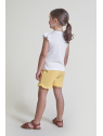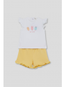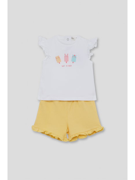 Camiseta blanca con volantes en las mangas y divertido estampado de helados en el frontal, con cierre de botones en la espalda. Shorts amarillos con volantes en el bajo y cintura elástica para un ajuste cómodo. Un conjunto alegre, cómodo y perfecto para el verano.