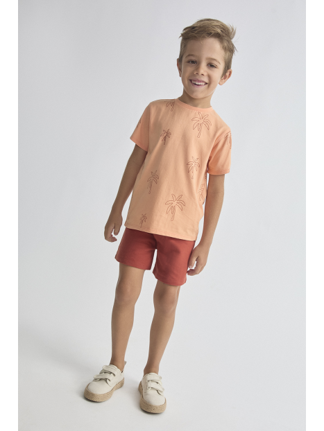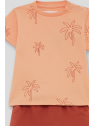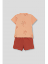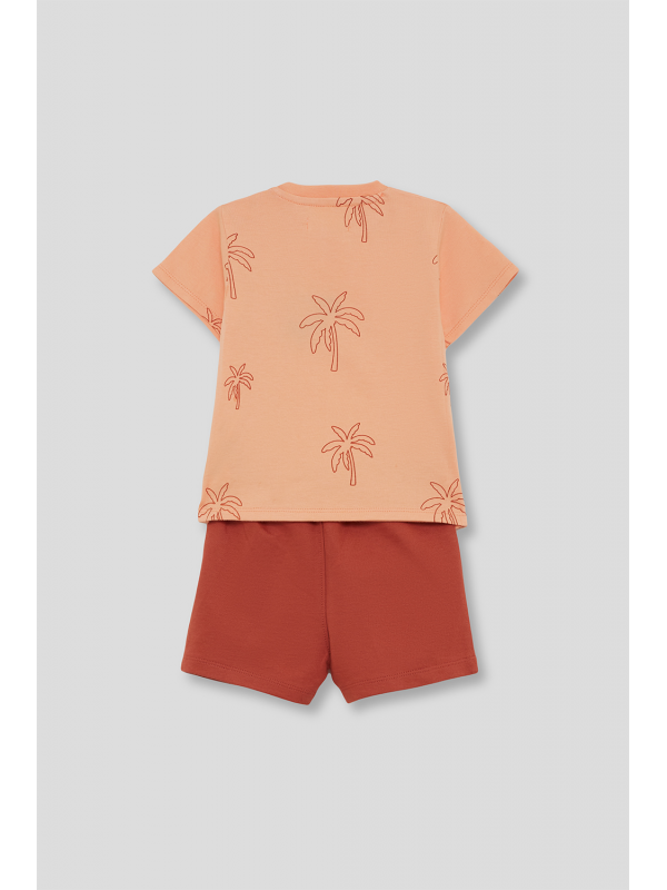 Conjunto de dos piezas para bebé niño de 3 meses a 6 años. Camiseta en color naranja con estampado integral de palmeras en contraste. Shorts en color teja con bolsillos delanteros y cintura elástica. Tejido de algodón fresco y suave, ideal para los días de verano.