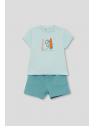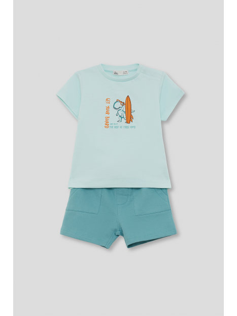 Camiseta verde agua de manga corta con estampado frontal de dinosaurio y tabla de surf. Shorts a juego en verde con cintura elástica y bolsillos delanteros.