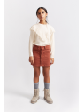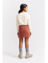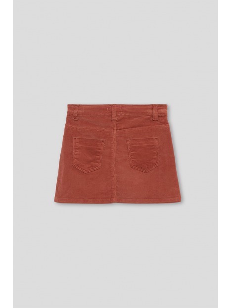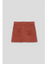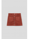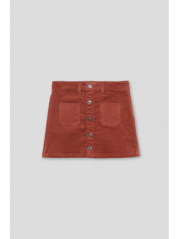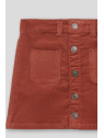 Falda corta en color tinto, confeccionada en tejido de pana con bolsillos delanteros de parche y cierre frontal con botones metálicos. Presenta trabillas para cinturón y cintura ajustable mediante goma interior. Espalda con bolsillos de plastrón.