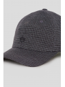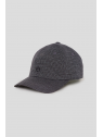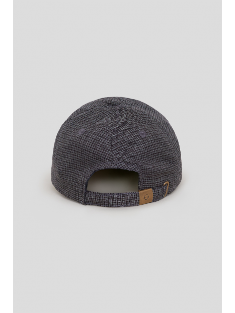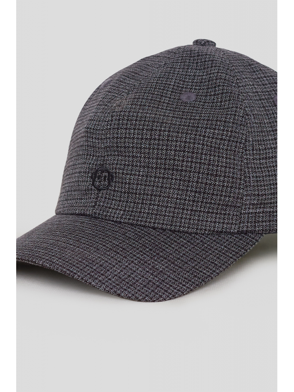 Modelo de seis paneles con visera curva, confeccionado en tejido estructurado con estampado pata de gallo en tonos neutros. Incluye cierre ajustable en la parte trasera con detalle de etiqueta en piel sintética grabada y bordado frontal del mono al tono.